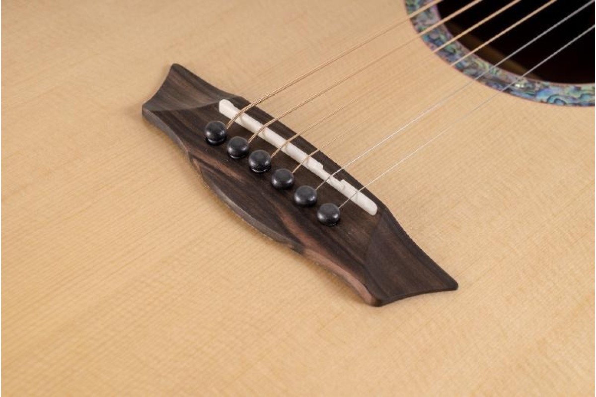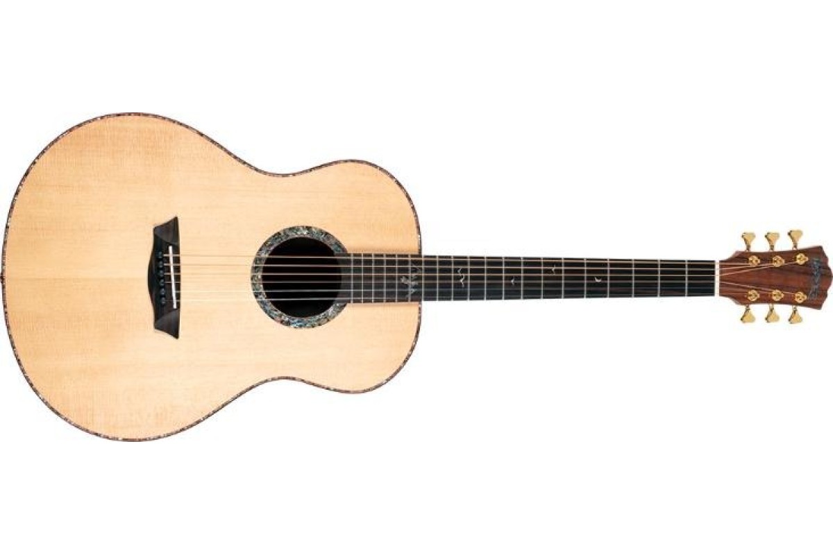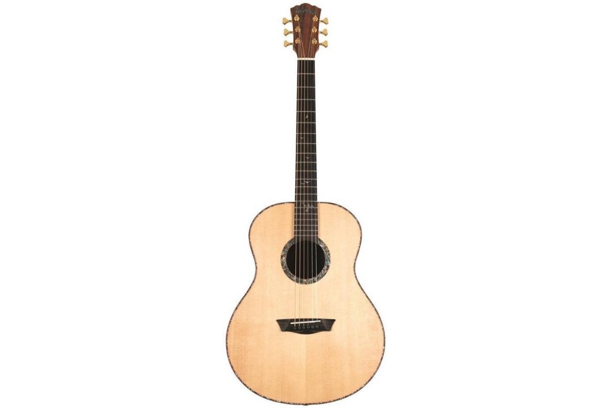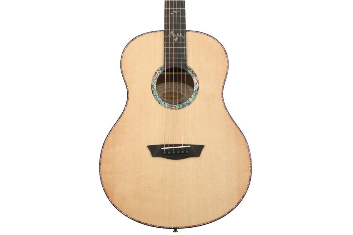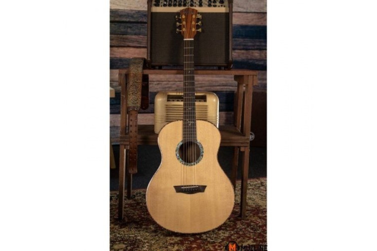 Він має топ з масиву ялинки і розкішне поєднання спинки та боків Pau Ferro. Дека прикрашена приголомшливим морським вушком як для розетки, так і для муркотання, яка додатково акцентується багатою родзинкою в падуці та чорною палітуркою. Ебеновий гриф продовжується з пишними призначеннями на вуха; із зображенням інкрустованої сцени гір та птахів у польоті. Дизайн корпусу Washburn Studio забезпечує неймовірно комфортні ігрові відчуття, зберігаючи при цьому жорсткі мінімуми, зосереджені середні частоти та чіткі максимуми, зазвичай пов'язані з більшими розмірами тіла. Суцільна вершина ялини допомагає визначити звукові нюанси по всьому регістру приладу. Його повна довжина шкали 25,5″ розширює кругозір знайомих гравців, а сучасний атласний профіль «C» на шиї з червоного дерева з гладким та приємним відчуттям у руках.