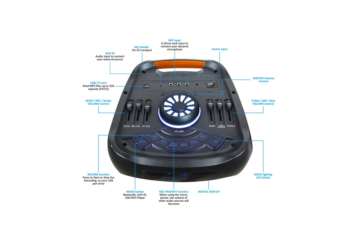 Портативна акустична система JB500PARTY BOX поєднує потужний звук, професійні підсилювачі та яскраву світлову підсвітку, створюючи ефект вечірки або шоу.