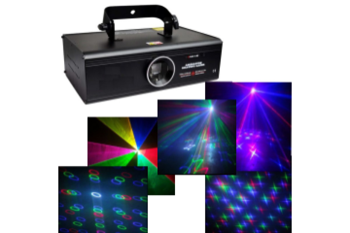 Лазер оснащений трьома джерелами світла: червоний 150mW, зелений 60mW, синій 200mW, що формує повнокольоровий спектр веселки та яскраві насичені промені. Кут розкриття 180° і кут відхилення 60° дозволяють максимально охопити простір і наповнити його динамічними лазерними ефектами.