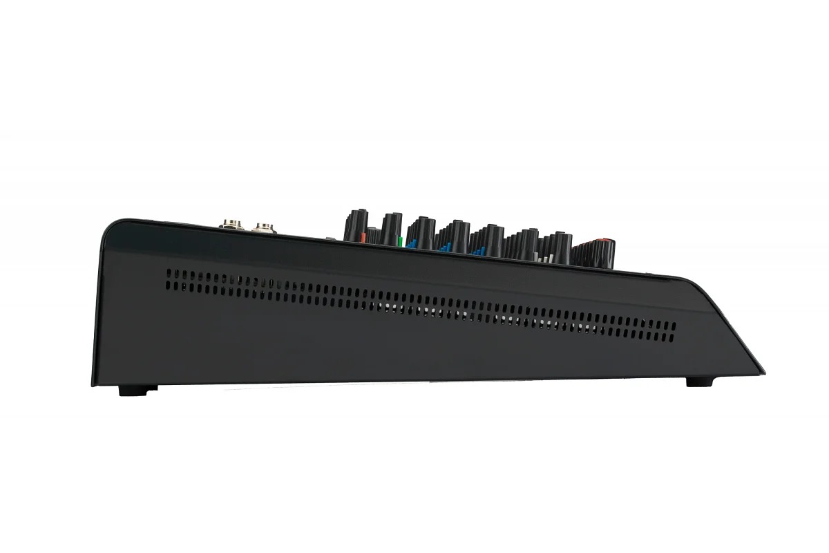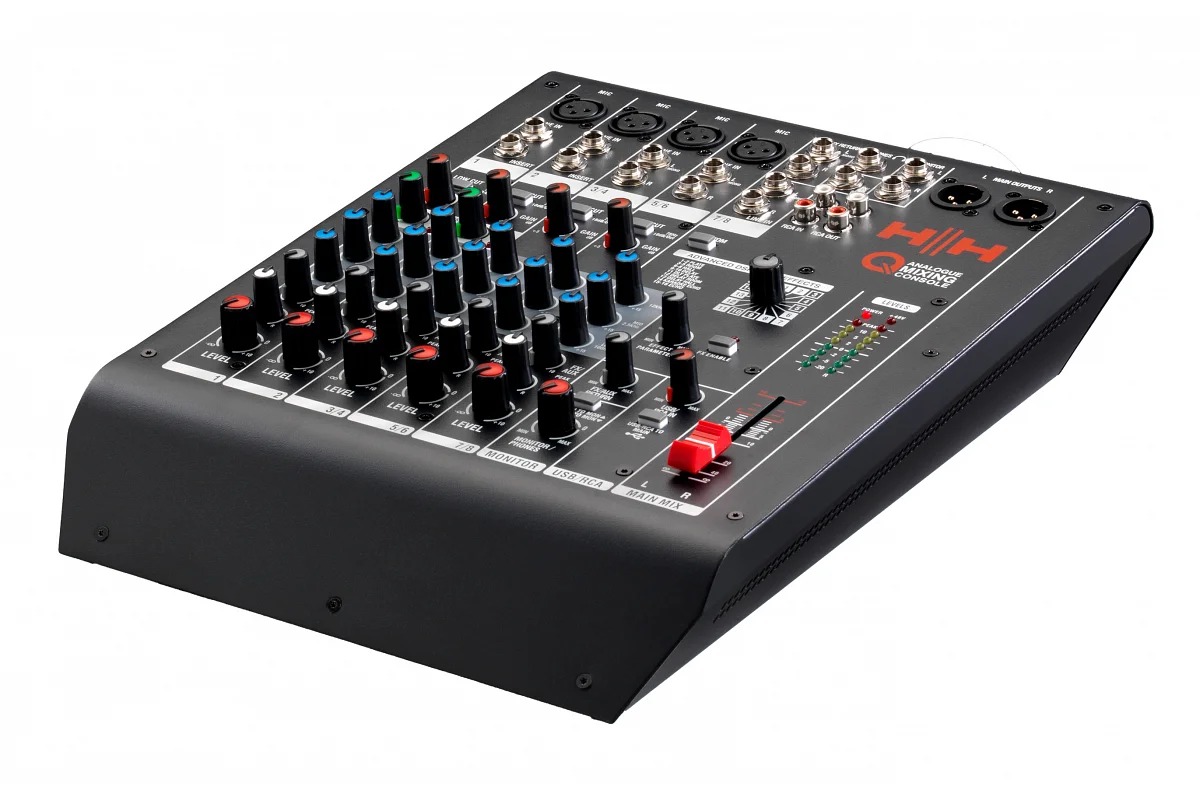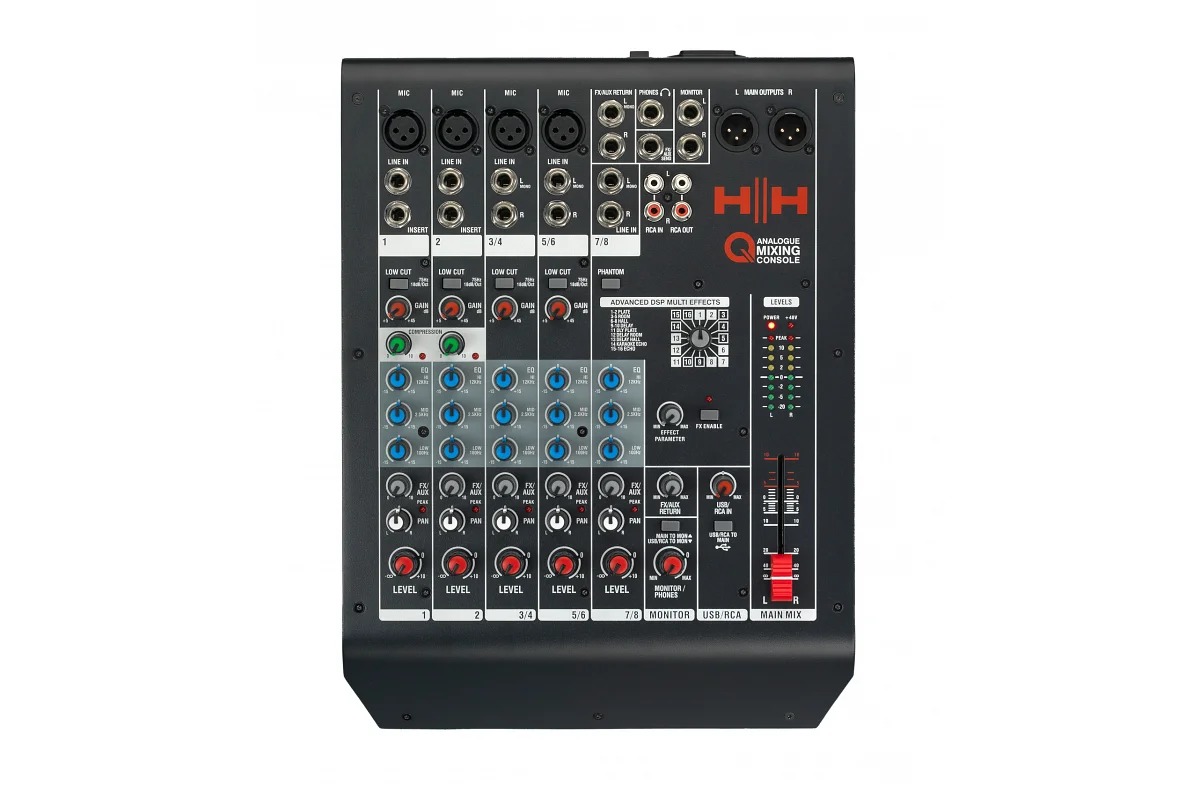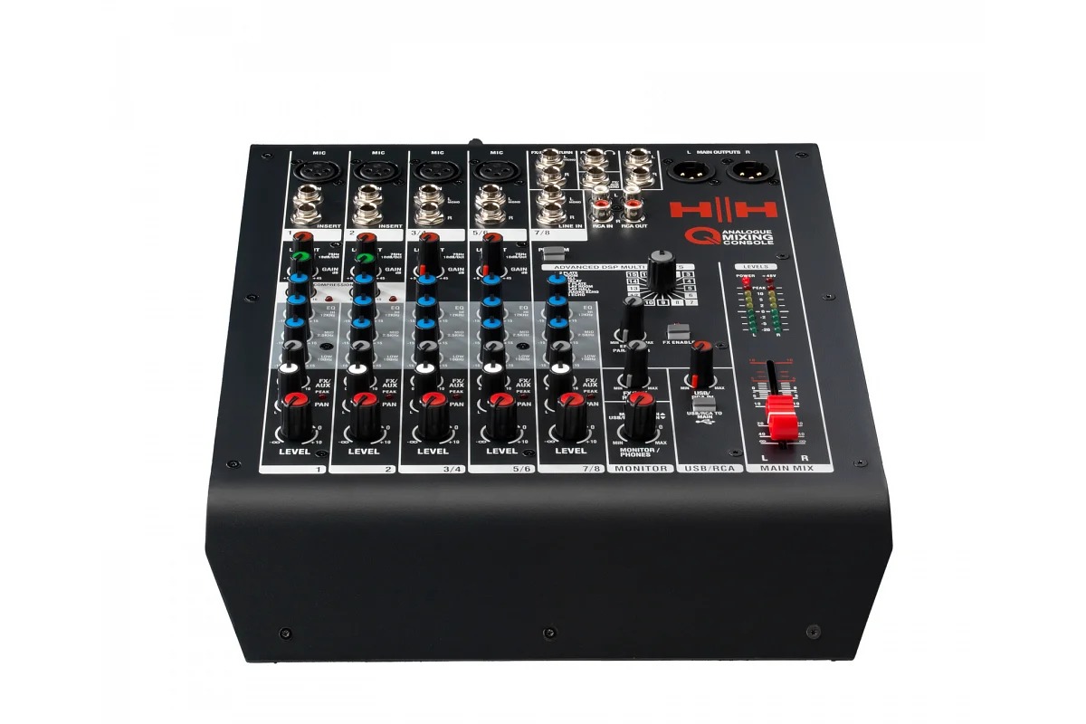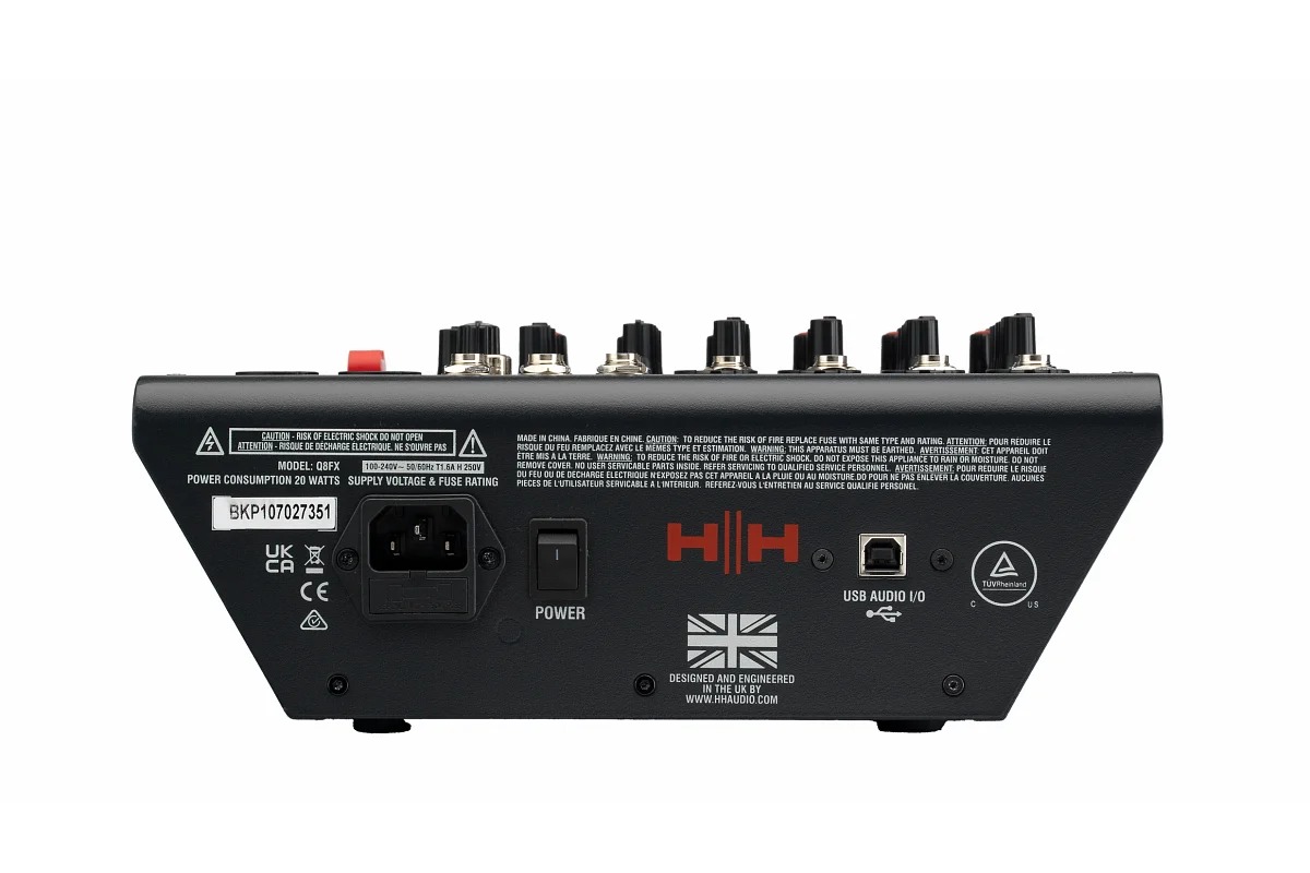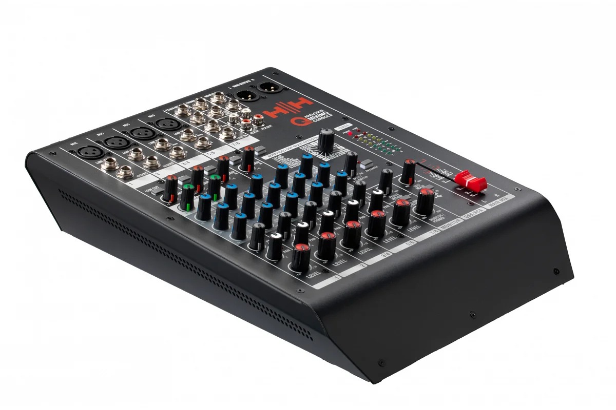 Q8FX – це 8-канальний аналоговий мікшерний пульт, розроблений та спроектований у Великій Британії. У пульті Q8FX є 4 мікрофонні входи з малошумливими передсилювачами, а також лінійні входи та моноінсерти на каналах 1 і 2. Крім того, він оснащений 3 стереовходами, що ідеально підходять для підключення електронних піаніно, синтезаторів, драм-машин або інших ліній.