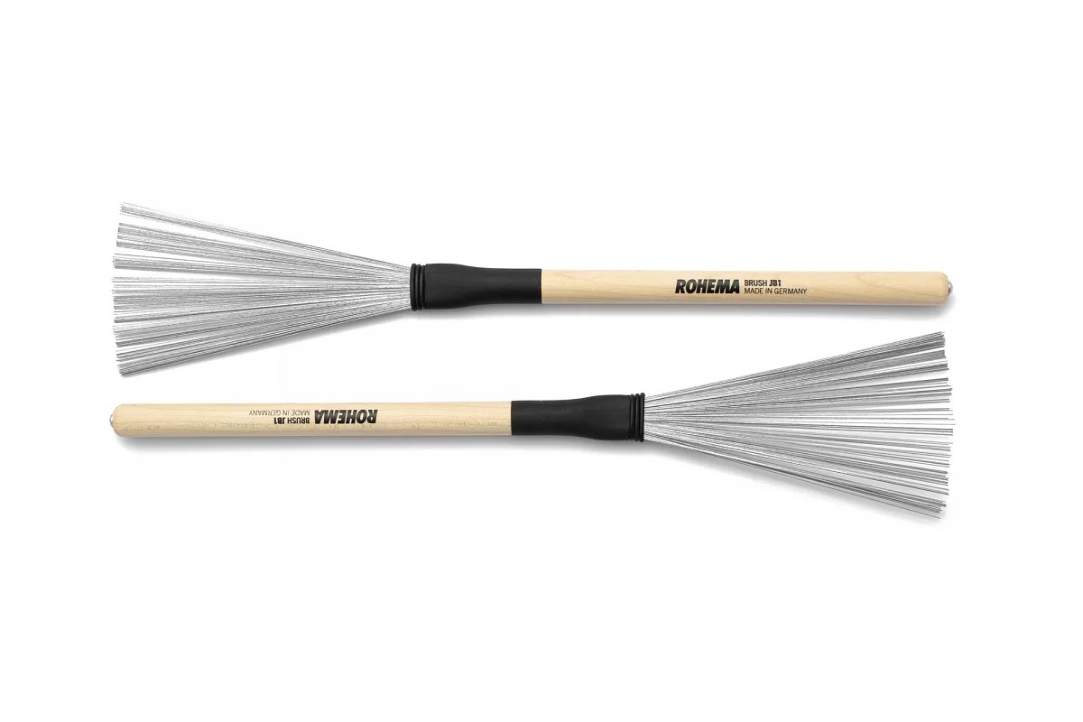 Джазова щітка Rohema JB 1 має тонку металеву щетину та дерев'яну ручку.
