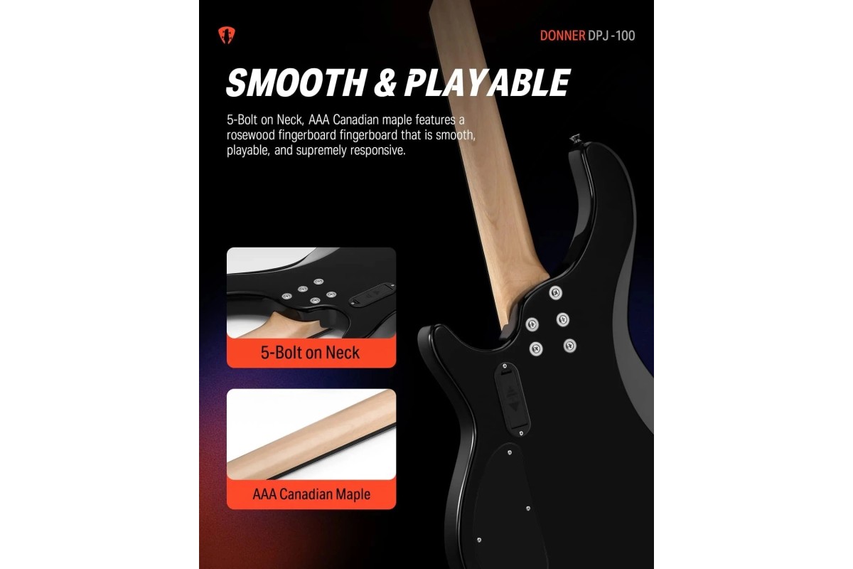 Щоб дати електрогітарі DPJ-100 потужну звукову основу, ми оснастили її парою кастомних звукознімачів у стилі PJ, які забезпечують жирний та насичений тон, широкий діапазон звуків та відмінну грабельність.