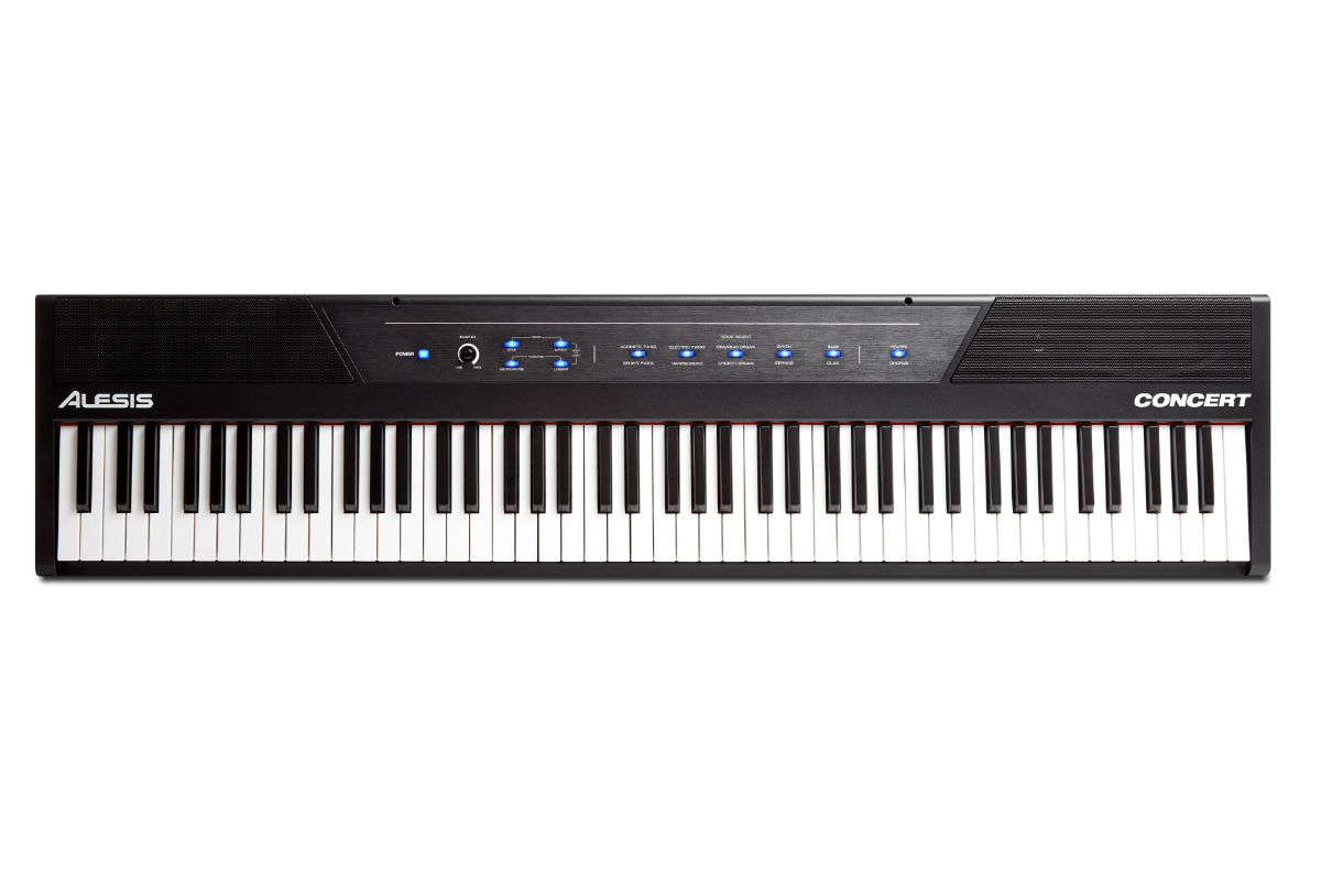 Alesis Concert – це повнофункціональне цифрове піаніно з 88 повнорозмірними напівзваженими клавішами з регульованою чутливістю до сили натискання. Concert має 10 вбудованих реалістичних тембрів: акустичне фортепіано, яскраве фортепіано, електричне піаніно, клавесин, струнний орган, церковний орган, синтезатор, струнні, бас-гітара та клавіші. Налаштуйте голоси, об'єднавши будь-які два одночасно в режимі Layer Mode для отримання повного насиченого тону. Вони також можуть бути призначені лише лівою чи правою рукою у режимі Split. Ви навіть можете додати регульовані реверберацію та хорус для подальшого налаштування звуку. Завдяки потужним 20-ватним вбудованим динамікам і 128-нотній поліфонії, Concert забезпечує ультра-реалістичний звук з відмінним ігровим досвідом.