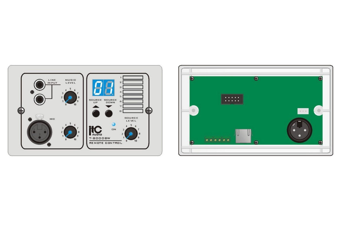 ITC T-8000BW призначений для дистанційного керування музичною трансляцією в заданій зоні в багатоканальних системах T8000. Дозволяє вибирати будь-який з 8-ми джерел сигналу, підключених до матричних контролеру ITC T8000, регулювати гучність. Передбачені регульовані мікрофонний і лінійний входи для підключення свого джерела сигналу безпосередньо в зоні трансляції.