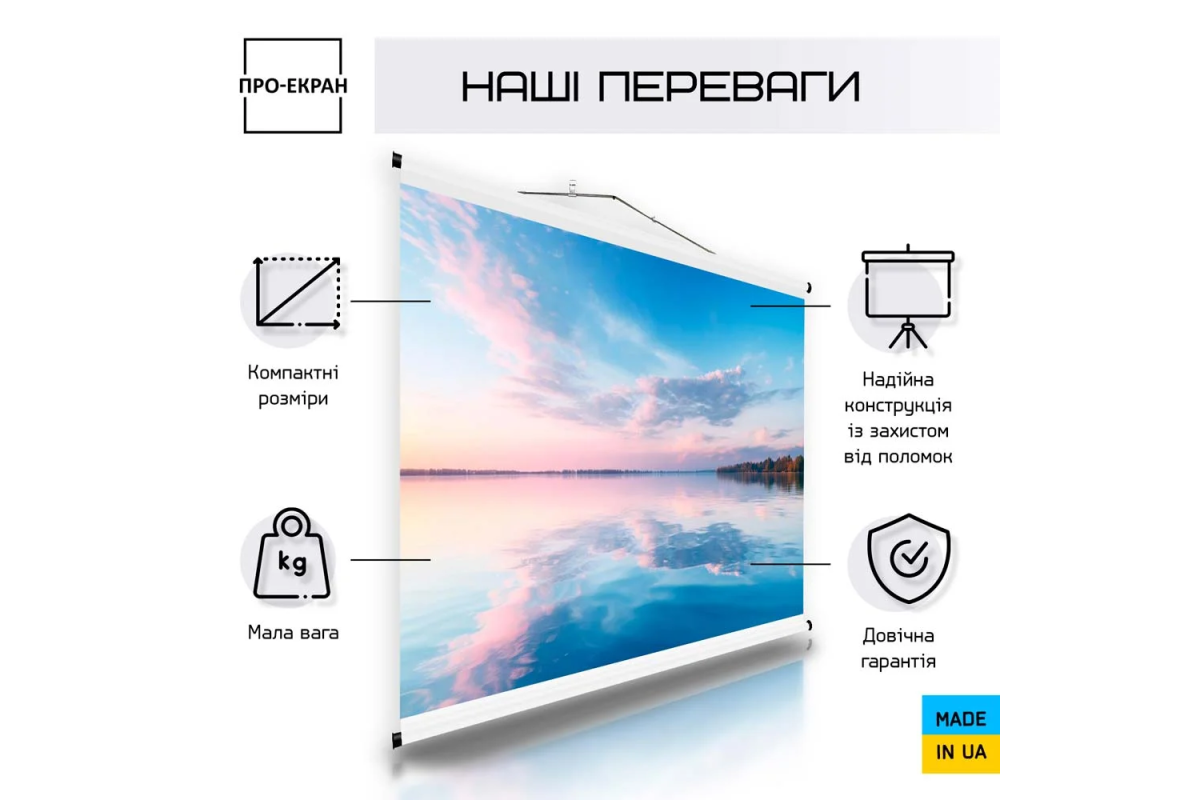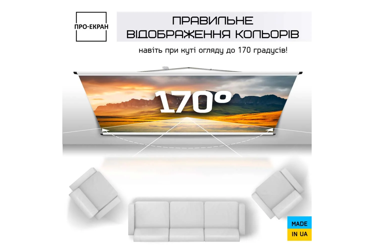 Для виготовлення екранів ПРО-ЕКРАН використовується високоякісне біле полотно ПВХ з коефіцієнтом посилення 1 і натуральною кольоропередачею. Матова поверхня екрану гарантує відсутність відблисків, забезпечує високу яскравість та великі кути огляду до 170 °.