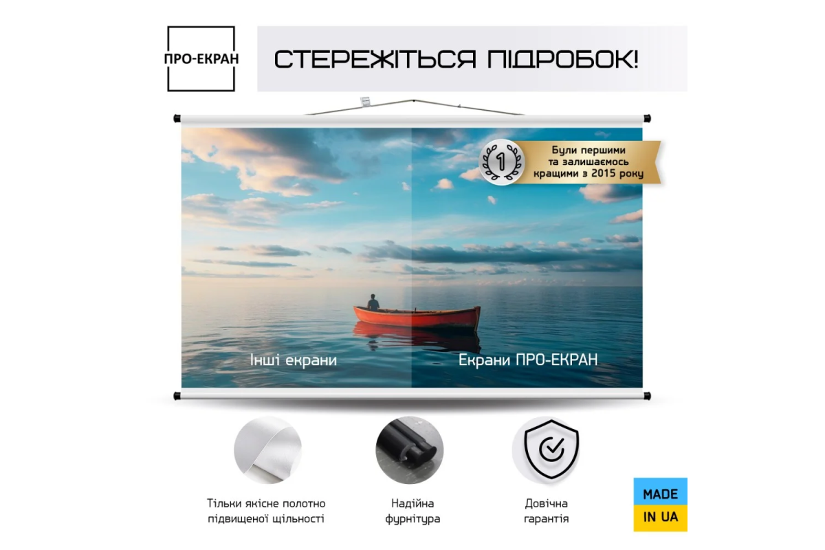 Для виготовлення екранів ПРО-ЕКРАН використовується високоякісне біле полотно ПВХ з коефіцієнтом посилення 1 і натуральною кольоропередачею. Матова поверхня екрану гарантує відсутність відблисків, забезпечує високу яскравість та великі кути огляду до 170 °.