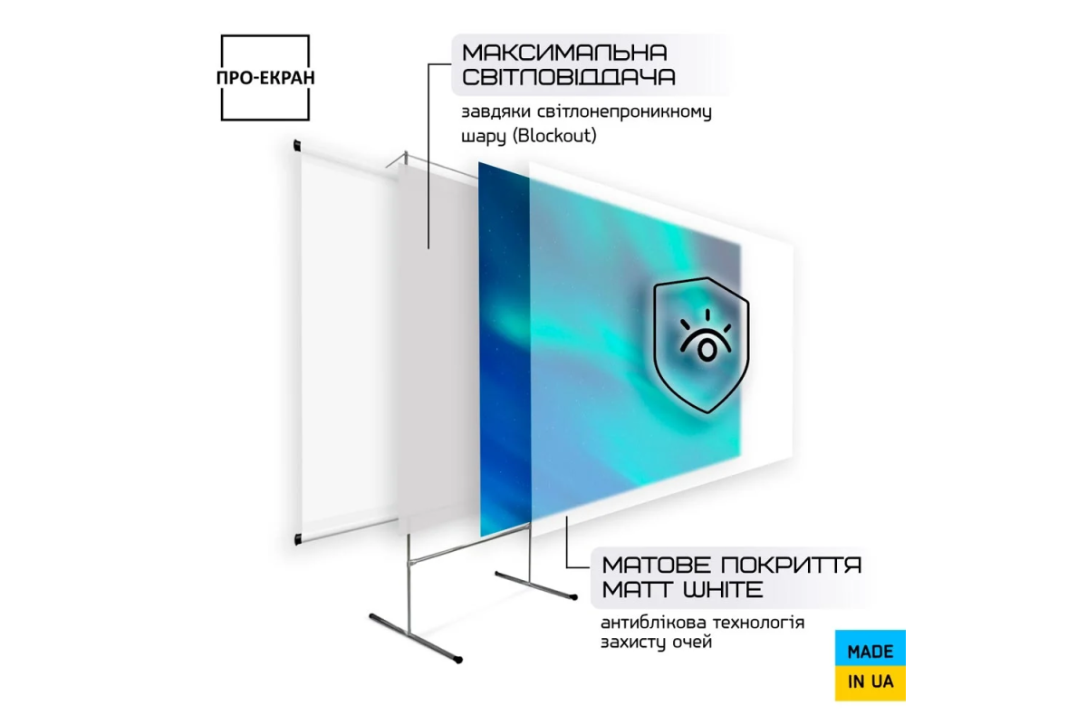Для виготовлення екранів ПРО-ЕКРАН використовується високоякісне біле полотно ПВХ з коефіцієнтом посилення 1 і натуральною кольоропередачею. Матова поверхня екрану гарантує відсутність відблисків, забезпечує високу яскравість та великі кути огляду до 170 °.