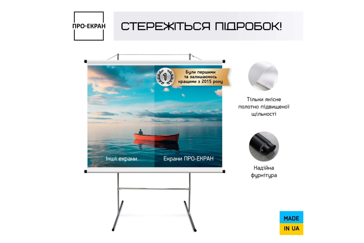 Для виготовлення екранів ПРО-ЕКРАН використовується високоякісне біле полотно ПВХ з коефіцієнтом посилення 1 і натуральною кольоропередачею. Матова поверхня екрану гарантує відсутність відблисків, забезпечує високу яскравість та великі кути огляду до 170 °.