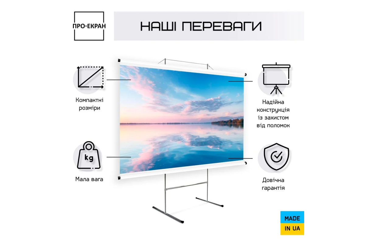 Мобільний екран для проектора із компактним розбірним штативом. Ідеальний варіант для демонстрації презентацій, фотографій, відеороликів та інших матеріалів у навчальних закладах, офісах, конференц-залах та виїзних презентацій.
