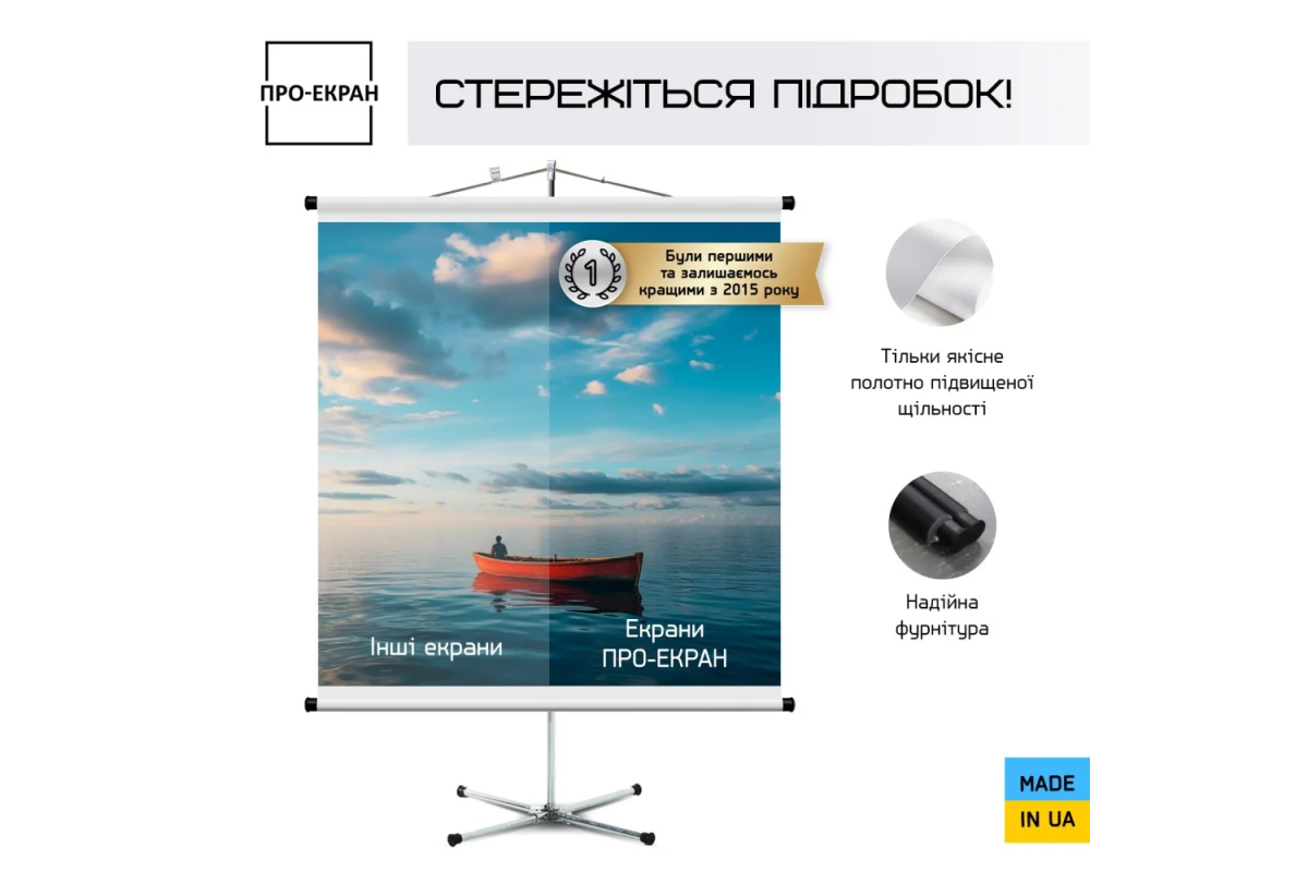 Для виготовлення екранів ПРО-ЕКРАН використовується високоякісне біле полотно ПВХ з коефіцієнтом посилення 1 і натуральною кольоропередачею. Матова поверхня екрану гарантує відсутність відблисків, забезпечує високу яскравість та великі кути огляду до 170°