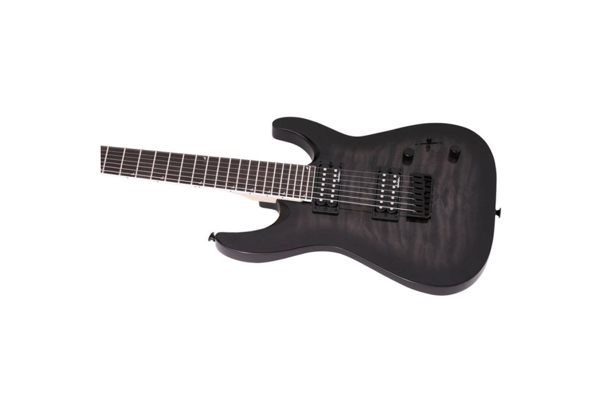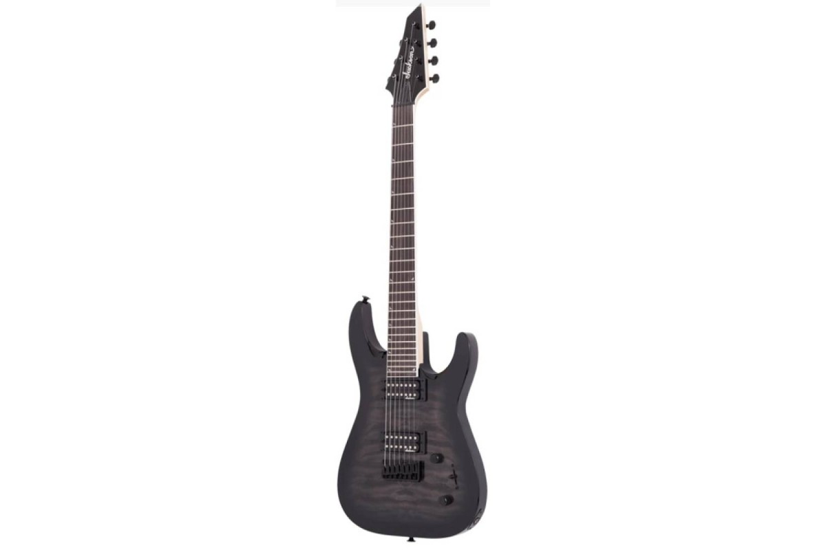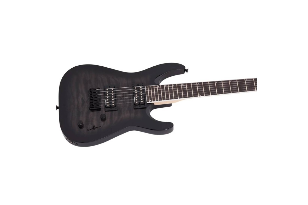 Електрогітара JACKSON JS22Q-7 DKA DINKY ARCH TOP HT TRANSPARENT BLACK BURST представлена в чорному кольорі з чорним хедстоком і фурнітурою.