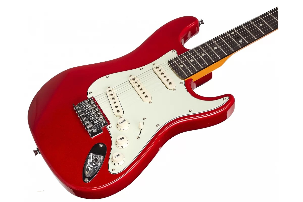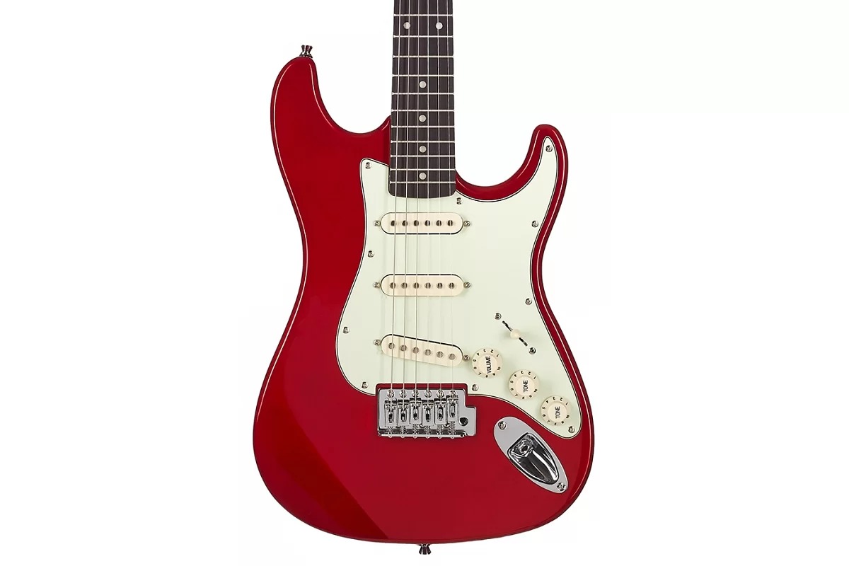Електрогітара Jay Turser JT-30-MRD 3/4 має корпус форми Stratocaster розміру 3/4 із деревини твердих порід, який буде зручний для юних музикантів та людей невеликої комплекції.