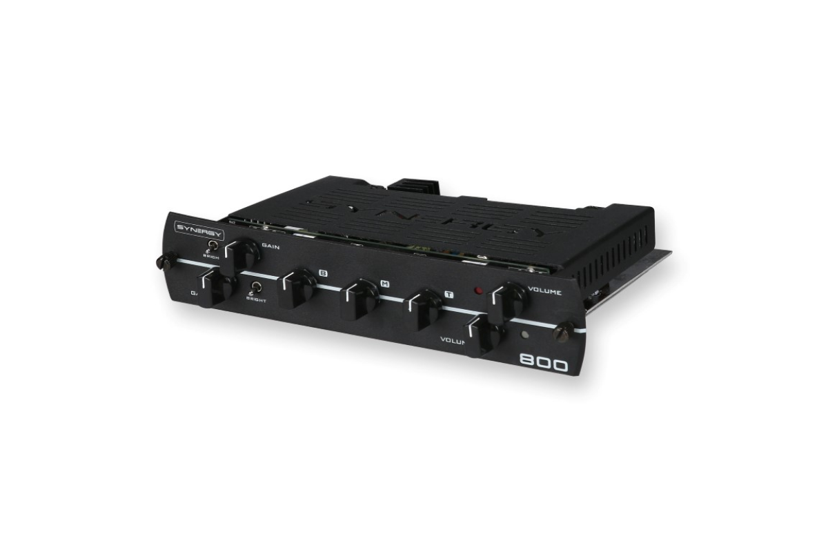 Якщо ви шукайте цей характерний кусачий тембр оригінального британця в Synergy сетап, 800 Preamp цей якраз, то, що потрібно. Ми пройшли довгий шлях, щоб цей модуль представляв тон підсилювача вкрай докладно. Дейв Фрідман з Friedman Amplification, який працював з незліченною кількістю 800-х, включаючи персональні підсилювачі багатьох гітарних богів, розробив цей модуль спираючись на свої великі знання про те, що робить великі підсилювачі дійсно особливими. Потім він модифікував модуль 800, додавши каналом з більш високим коефіцієнтом посилення, який змушує ваш тон проникати в ще більш густу гармонійну зону. І для ще більшого ефекту, обидва канали цього підсилювача з 12АX7 лампами оснащені переключателямм bright, гарантуючи, що кожна ваша нота прорізається в міксе.Synergy 800 оснащений двома каналами з регуляторами посилення і гучності і перемикачами bright. Обидва канали ділять між собою трисмуговий еквалайзер.