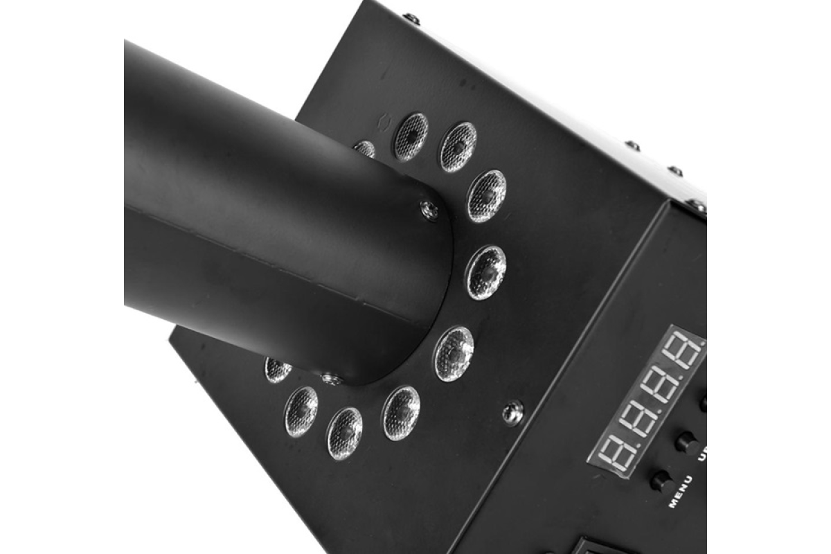 Пристрій створює щільний білий стовп туману, який миттєво розсіюється у повітрі без залишків, що дозволяє безпечно використовувати його у приміщеннях. Управління можливе як вручну, так і дистанційно — через DMX-контролер. Завдяки яскравим кольоровим LED-ефектам, DC-21 додає динаміки до сценічних виступів або шоу-програм.