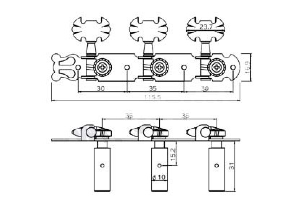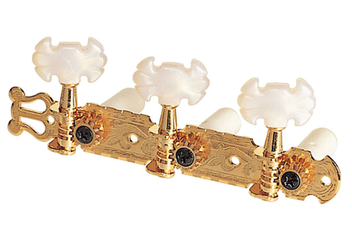 PAXPHIL JC79 GD — стильні та надійні кілки для класичної гітари, що забезпечують плавне і точне налаштування струн. Модель має традиційну конфігурацію 3+3 та оснащена акриловими ручками для зручного обертання. Позолочені пластини додають естетичності та захищають механізм від корозії, забезпечуючи тривалий термін служби.