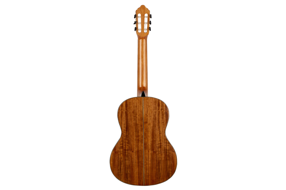 Верхня дека виготовлена з сітхінської ялини, що забезпечує яскравість і чіткість звучання, тоді як нижня дека та обичайка з горіха додають теплоту та глибину тону. Опукла форма задньої деки посилює резонанс і природну проекцію.