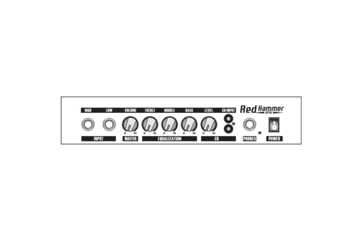 Панель управління включає регулятори гучності (Master Volume), 3-смуговий еквалайзер (Treble, Middle, Bass) та окремий регулятор для підключення CD-входу. Підсилювач має два входи на роз'ємах TRS 1/4" (High і Low) для підключення бас-гітари, а також RCA-вхід для CD. Для занять у тиші передбачений вихід для навушників.