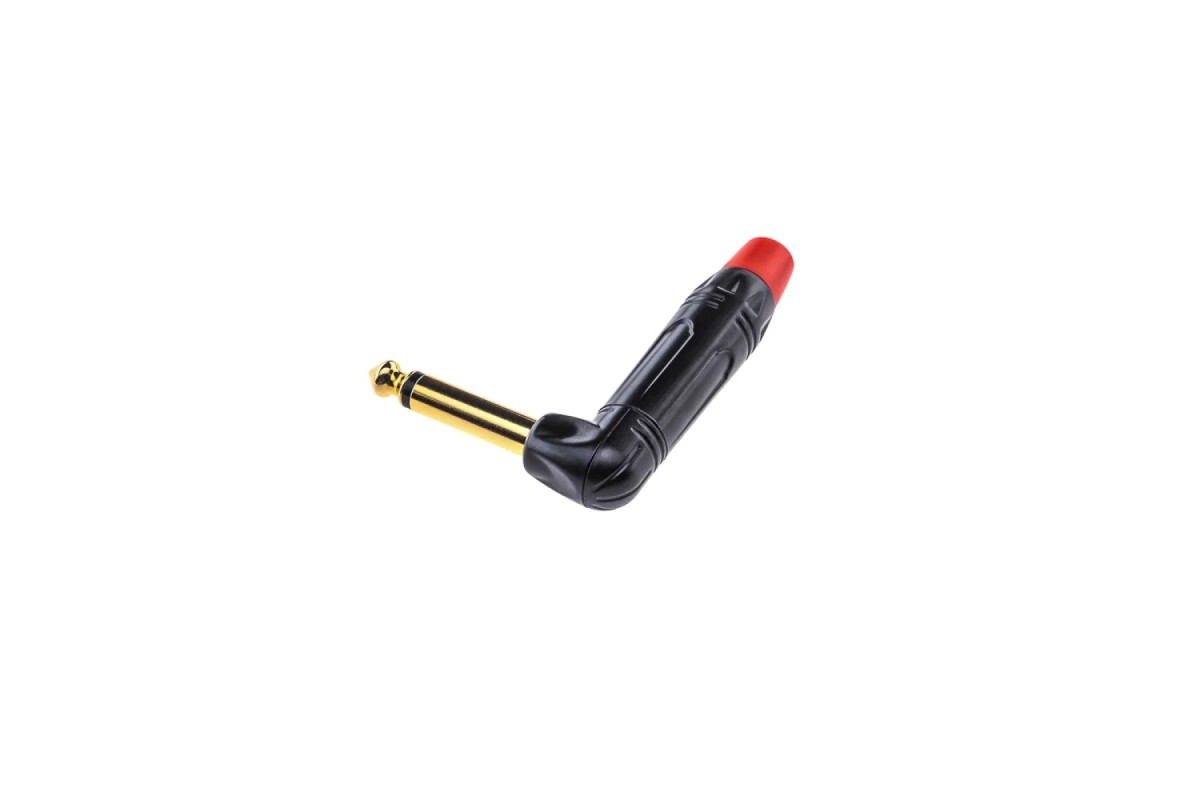 Maximum Acoustics JMRG.BL – 6,3 мм (1/4") моно роз'єм під кутом 90° з позолоченими контактами, металевий корпус і гумовий тримач кабеля. Колір – чорний (корпус)/червоний (тримач кабеля).