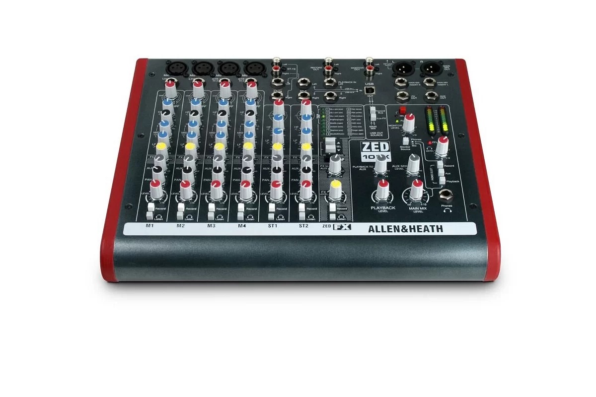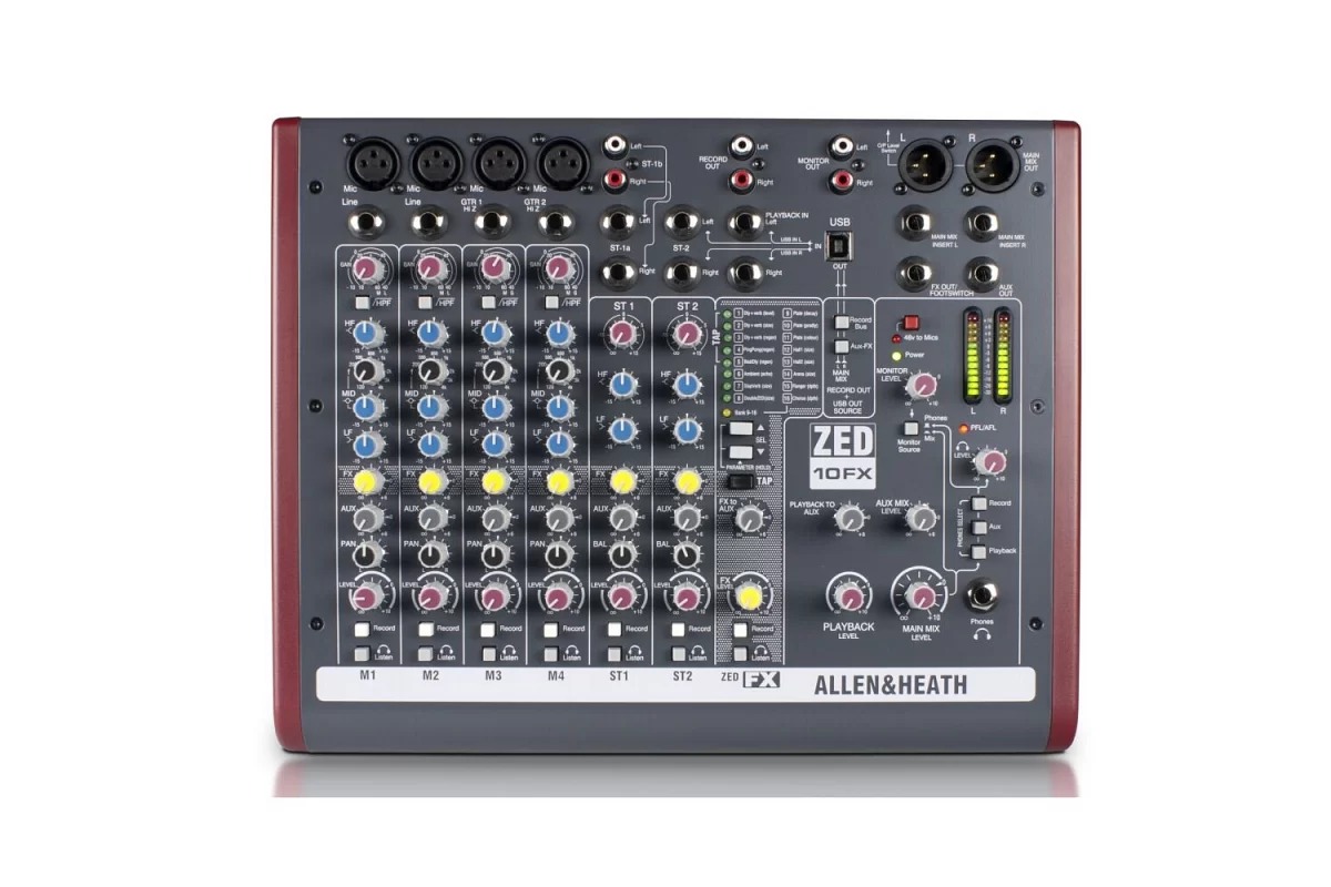 Мікшерний пульт Allen & Heath ZED 10FX - це нова модель, яка може використовуватися як для роботи з живим звуком, так і для звукозапису. Мікшер прекрасно підходить для використання сольними музикантами або невеликими музичними колективами, для застосування в школах, конференц-залах або храмах. Два високоомних входу на польових транзисторах класу Адают можливість підключати безпосередньо до мікшера музичні інструменти. На двох вхідних каналах є перемикачі підвищення чутливості на 26 дБ. На Allen & Heath ZED 10 можна мікшувати до 4 мікрофонів і 2 стереоджерел. Allen & Heath ZED 10 має два посили aux (один pre і один post fade) для ефектів і моніторів, окремо перемикати стерео шину. Канали 1 і 2 - це універсальні мікрофонно-лінійні входи на роз'ємах Jack і XLR. Канали 3 і 4 можуть бути використані, як високоомні гітарні входи. Обидва стереоканалу мають входи на стандартних джеках, а 1 з них ще має і пару phono роз'ємів для CD-програвача. Пульт комплектується програмою X-Gear Amplitube.