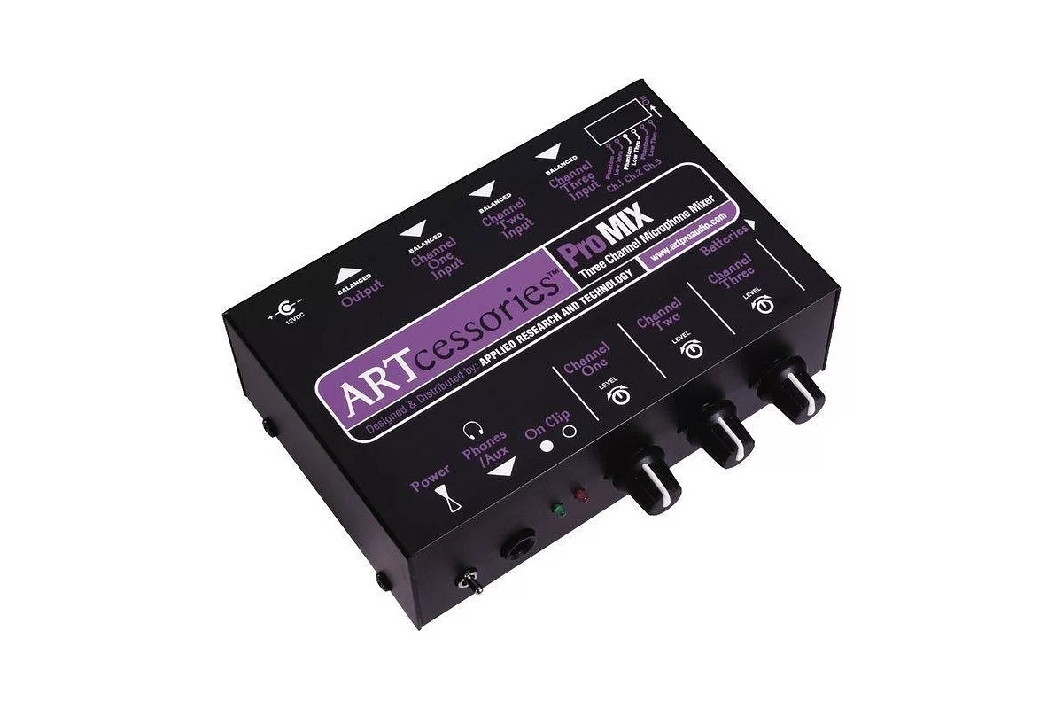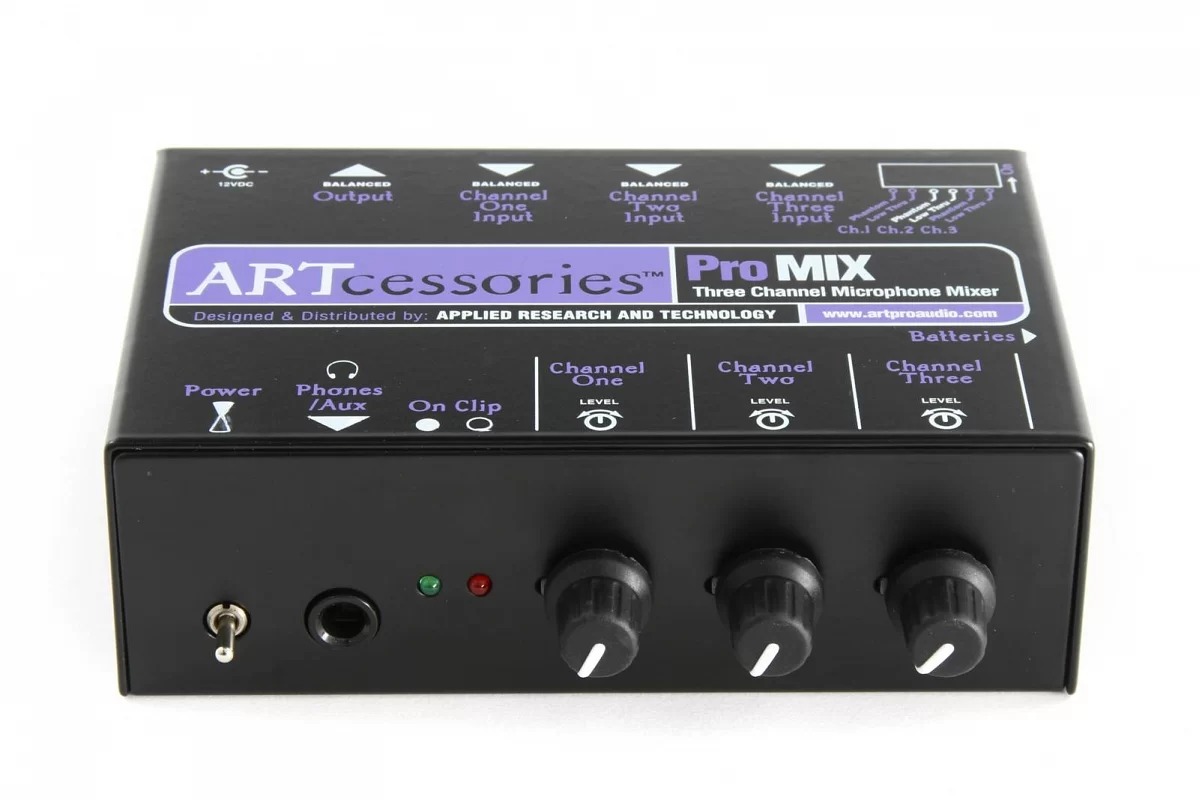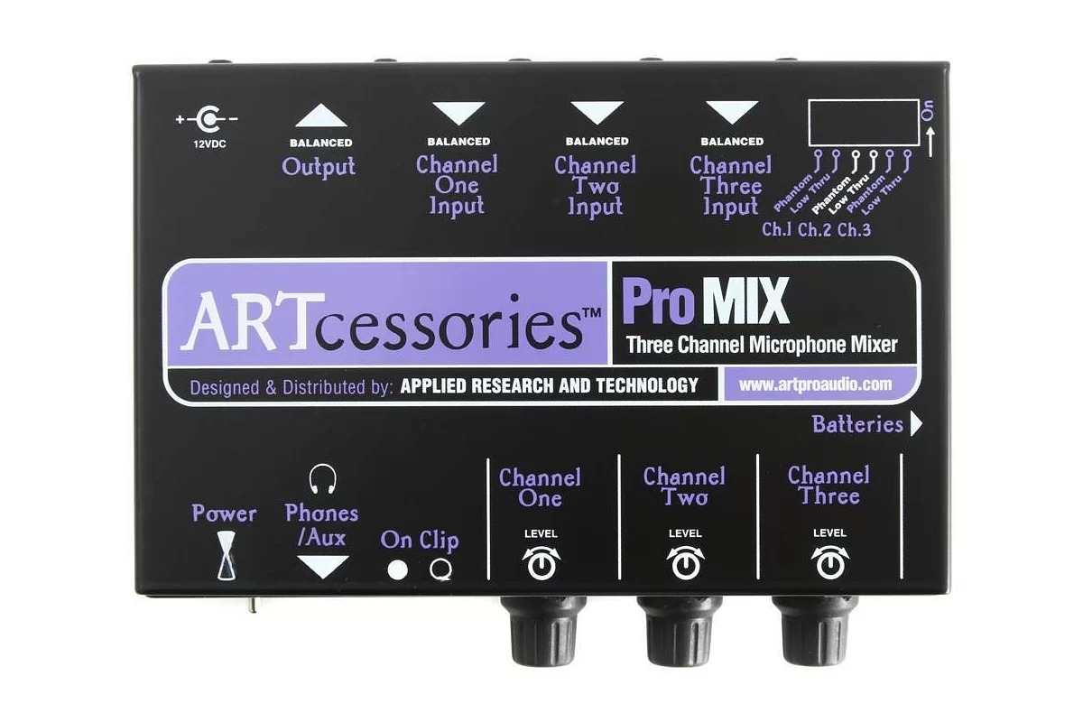 Мікшерний пульт ART PROMIX є компактним професійним 3-канальним мікшером. Розроблено як просте, економічно ефективне рішення для мікшерів та підсилювачів з мінімальними мікрофонними входами. PROmix має 3 мікрофонні входи з 3-контактними роз'ємами XLR (мама). Мікшер здатний подавати до 18 В фантомного живлення конденсаторним мікрофонам. Крім того, мікшер забезпечений одним збалансованим мікрофонним виходом XLR (тато). 1/4" вихід для навушників подвоюється як альтернативний лінійний вихід. Управління регулювання рівня розташовані на кожному каналі.