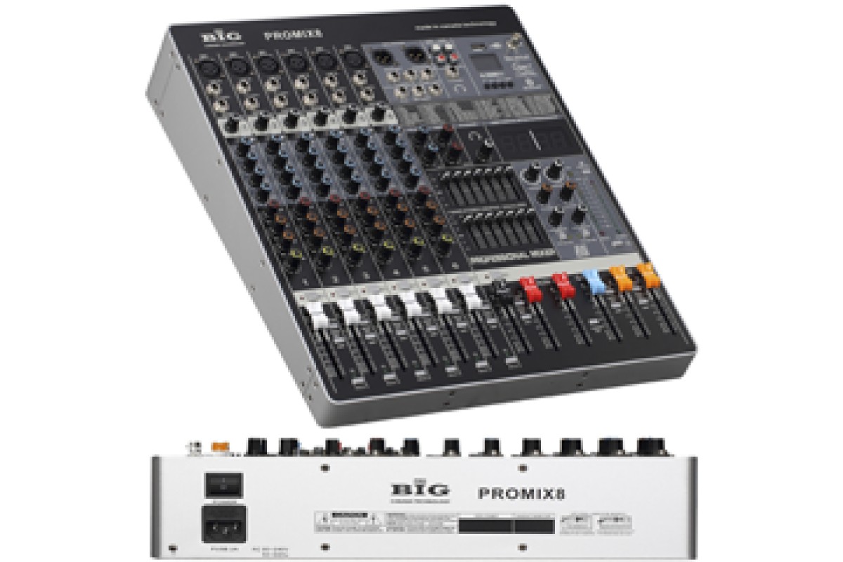 Завдяки подвійному графічному еквалайзеру (2×7 смуг), індикаторам рівня сигналу (12-смуговим LED) та повзунковим фейдерам, BIG PROMIX8 забезпечує точний контроль над міксом та стабільну роботу навіть у найскладніших умовах.
