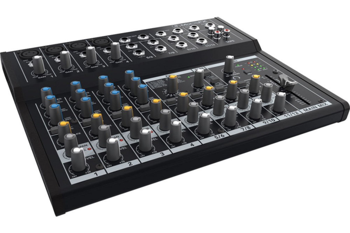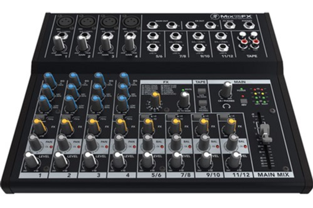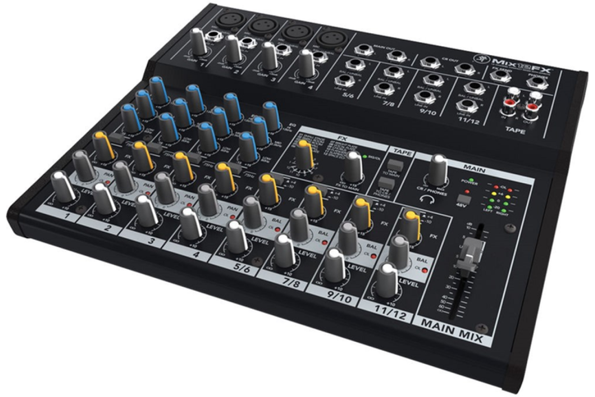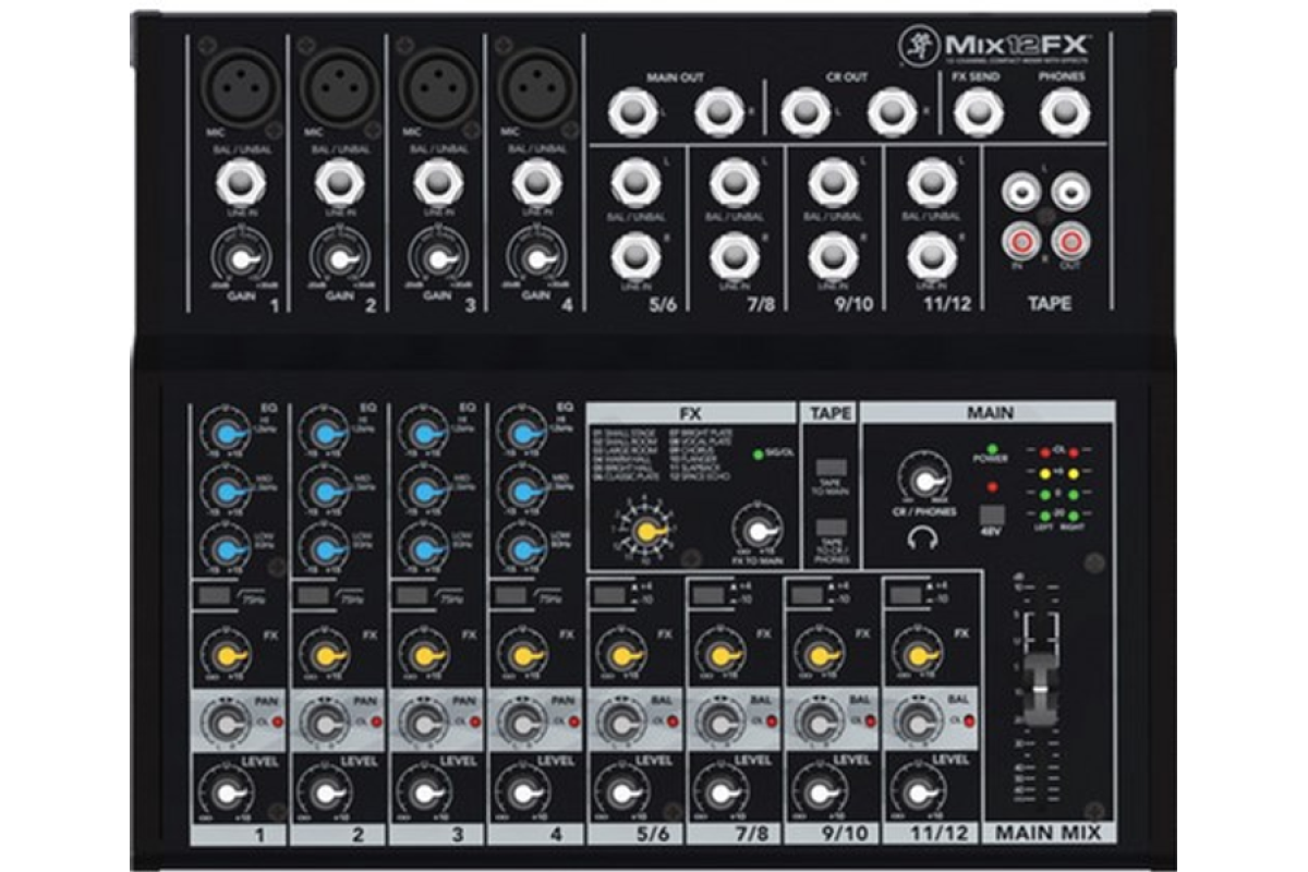 Mackie Mix12FX - професійний, доступний, компактний мікшерний пульт від світового лідера Mackie. Всі компоненти пульта високої якості, міцний металевий корпус і функції, розроблені для різних додатків. Технічні характеристики Mackie Mix12FX: Входи: XLR - 4, RCA - 2, Лінійний вхід 1/4 "- 4 Виходи: XLR - 4, Вихід на навушники 1/4" - 1, RCA - 2, Головний вихід 1/4 "- 1, Моніторний вихід 1/4 "- 4, Балансний вихід - 4, вихід на запис (REC) - 1, Send 1/4" - 1 Обробка сигналу: Еквалайзер - 3-смуговий на моноканалах +/- 15 дБ: ВЧ ( High): 12 кГц, CЧ (Middle): 2.5 кГц, НЧ (Low): 80 Гц Ефекти: 12 вбудованих ефектів, включаючи реверберацію, хорус і ділей. Специфікації: • Діапазон частот: 20 - 30000 Гц • Максимальний рівень сигналу XLR: +19 дБВ • Решта входів / виходи: +21 дБВ • Співвідношення сигнал / шум: -122 дБВ • Коефіцієнт нелінійних спотворень: -70 дБ (1 кГц) • Опір: Мікрофонний вхід - 3.8 кОм, Решта входів - 10 кОм (або більше ), Вихід на навушники - 22 Ом, Решта виходи - 120 Ом (небалансний), 240 Ом (балансні), RCA - 1 кОм Загальні характеристики: • Екран: Немає • Бездротові можливості: Немає • Харчування: 18 В (змінний струм), 1000 ма • Розміри: 5.3 х 29.7 х 24.4 см • Вага: 1.7 кг • Комплектація: Мікшерний пульт Mackie Mix12FX • Вид: Аналоговий • Тип: Пасивний • Кількість каналів: 12 • Гарантія: 12 місяців