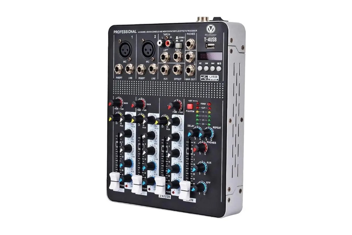 MixMaster T-4 - це пасивний мікшерний пульт в компактному металевому корпусі, 2 мікрофонних/лінійних каналів з фантомним живленням +48В та 1 стерео/USB канал.