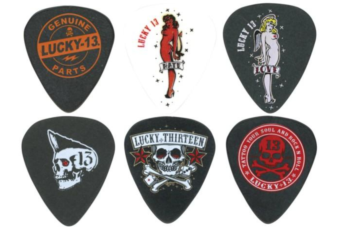 Набір медіаторів Lucky 13 Artist Series – результат співпраці компаній Dunlop та Lucky 13, що поєднує стиль і функціональність. Кожен медіатор має унікальну графіку у вигляді хот-родів, пляшок віскі та вінтажних татуювань, що робить його колекційним і стильним аксесуаром для гітаристів.