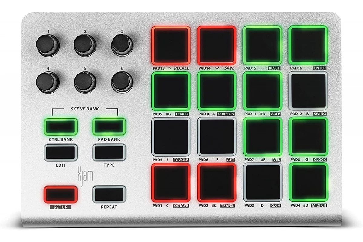 Його гладкі і надчутливі педи з поліфонічним післядотиком настільки ж універсальні, як і Xjam загалом. 16 педів RGB також надсилають повідомлення MIDI CC, MIDI Program Change або MMC. Також на борту є 6 високоякісних нескінченних енкодерів, які можна використовувати по-різному. На додаток до керування повідомленнями MIDI CC, енкодери можуть бути призначені для надсилання повідомлень про висоту тону, повідомлення про зміну програми MIDI або навіть повідомлення післяторкання. Xjam поставляється з потужним програмним редактором для ідеальної адаптації до ваших потреб. Також є роз'єм TRS-MIDI Out для надсилання сигналів на зовнішні звукові генератори.