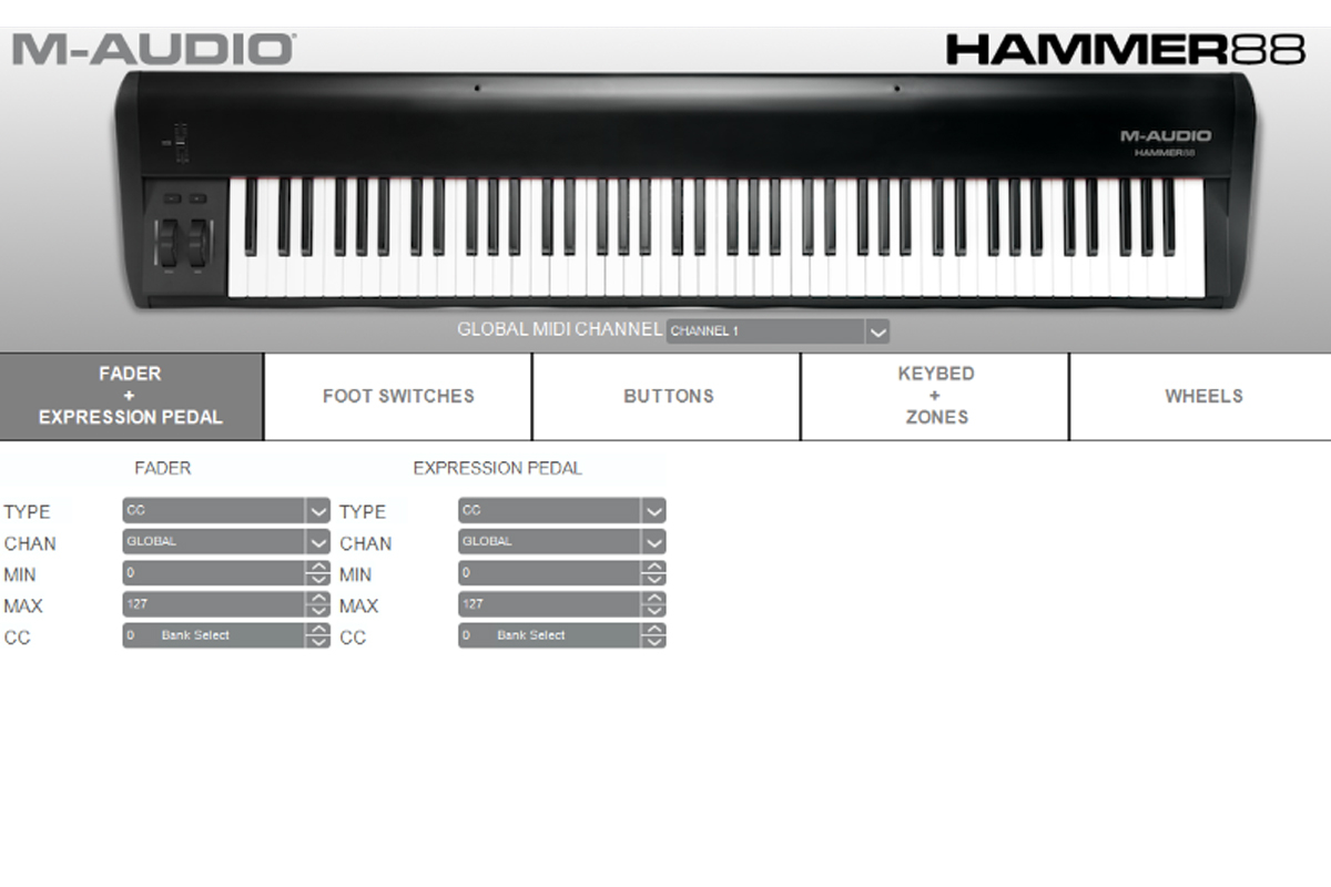 Hammer 88 оснащена найнеобхіднішими елементами управління для вираження твоєї музичної експресії. Колеса висоти тону і модуляції додадуть ефекти портаменто і гліссандо, або ж перепризначуваних колесо модуляції для управління будь-яким іншим параметром, щоб змінювати звучання віртуальних інструментів прямо під час виконання. Окремий фейдер майстер-гучності при необхідності також може бути призначений на будь-яку іншу MIDI-сумісну функцію. Кнопки Up і Down дозволяють вибирати різні програми, ефекти, перемикатися між октавами і багато іншого. Для ще більшої виразності ти можеш підключити педалі до входів Sustain, Expression і Soft на задній панелі Hammer 88.