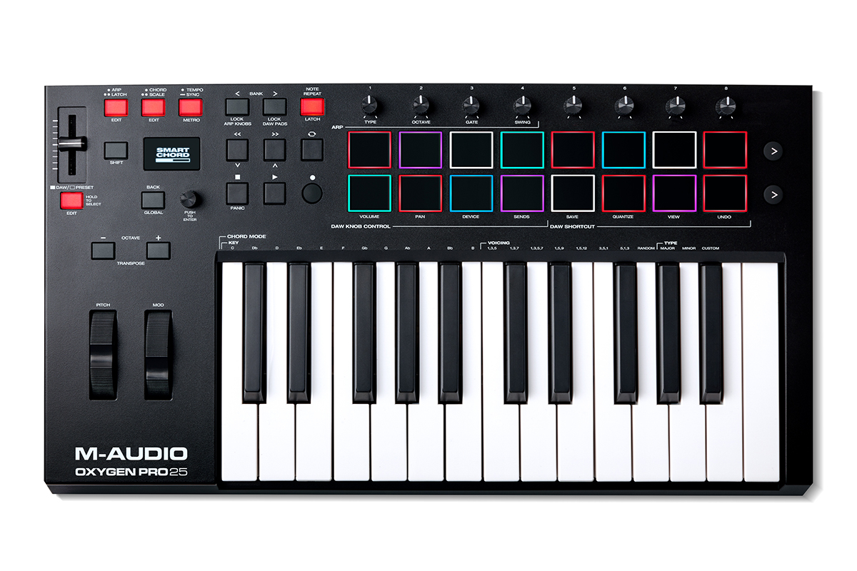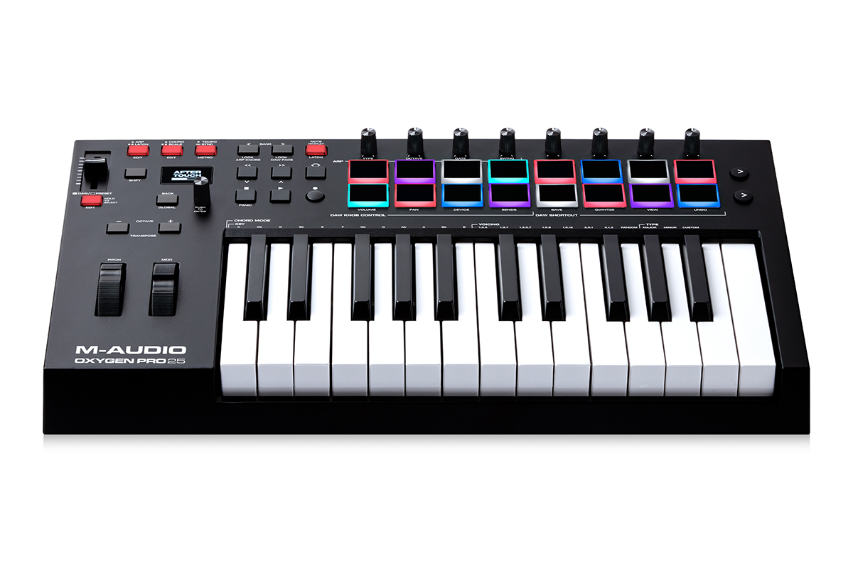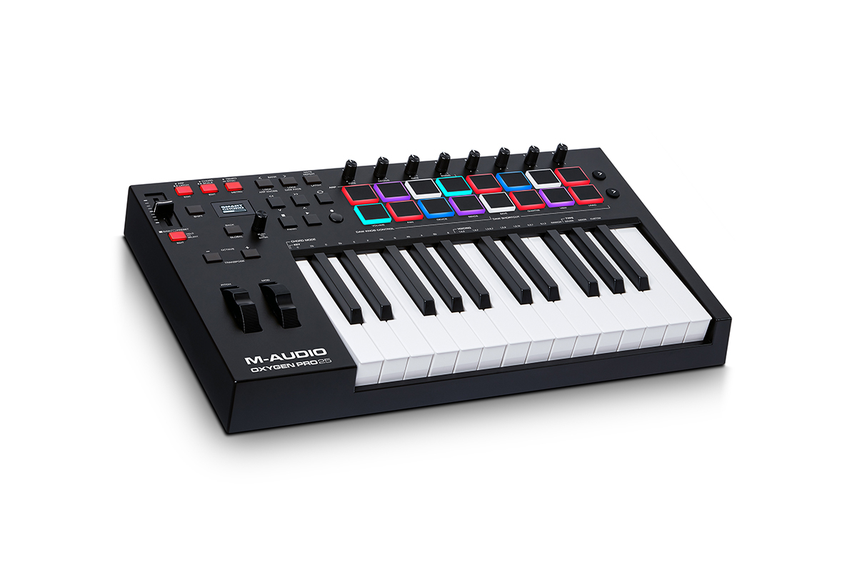 Поєднання 25 кращих в своєму класі, чутливих до швидкості натискання, напівзважених клавіш з послекасанием і призначаються зонами, вбудований арпеджиатор, 16 призначаються педів з RGB підсвічуванням, чутливих до швидкості натискання і повторенням нот, 8 регуляторів і 9 призначаються фейдеров, Oxygen Pro 25 поставляється з усім необхідним, щоб максимально використовувати можливості твоїх віртуальних інструментів і DAW.