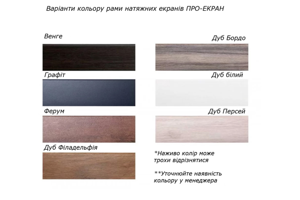 Суворий, лаконічний дизайн рами з MDF шириною 8 см дозволить вписати цей екран в будь-який інтер'єр, а також точно підібрати колірне рішення завдяки 7 різним кольорам рами (венге, білий дуб, графіт, ферум, дуб Персей, дуб Філадельфія, дуб Бордо).