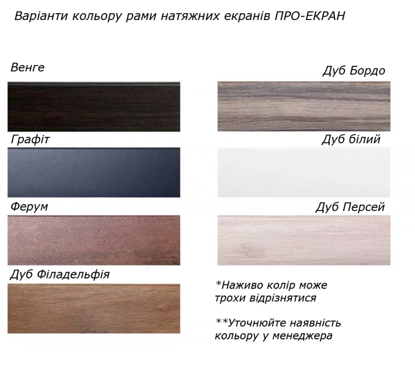 Суворий, лаконічний дизайн рами з MDF шириною 8 см дозволить вписати цей екран в будь-який інтер'єр, а також точно підібрати колірне рішення завдяки 7 різним кольорам рами (венге, білий дуб, графіт, ферум, дуб Персей, дуб Філадельфія, дуб Бордо).