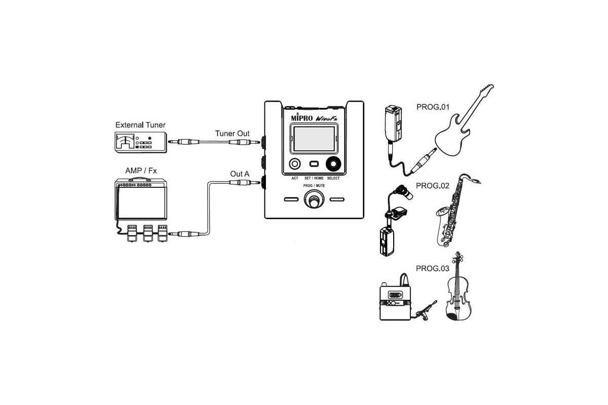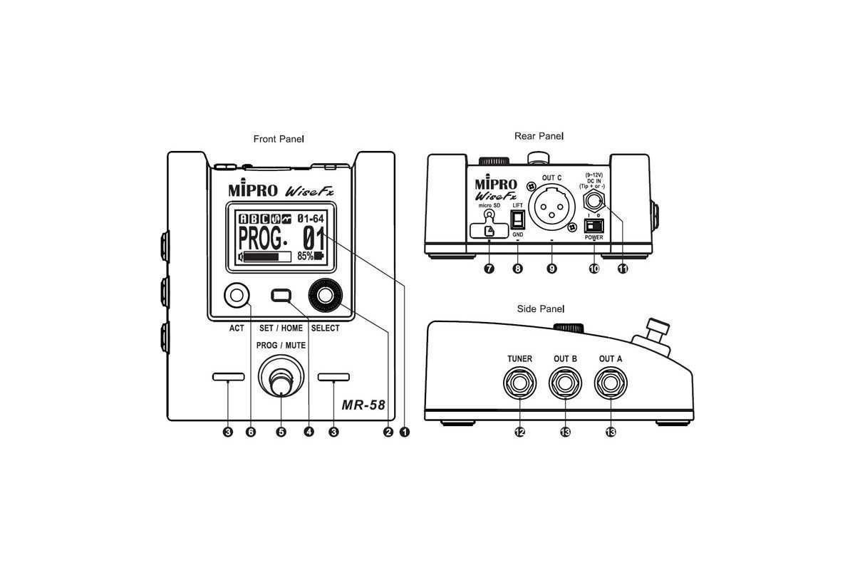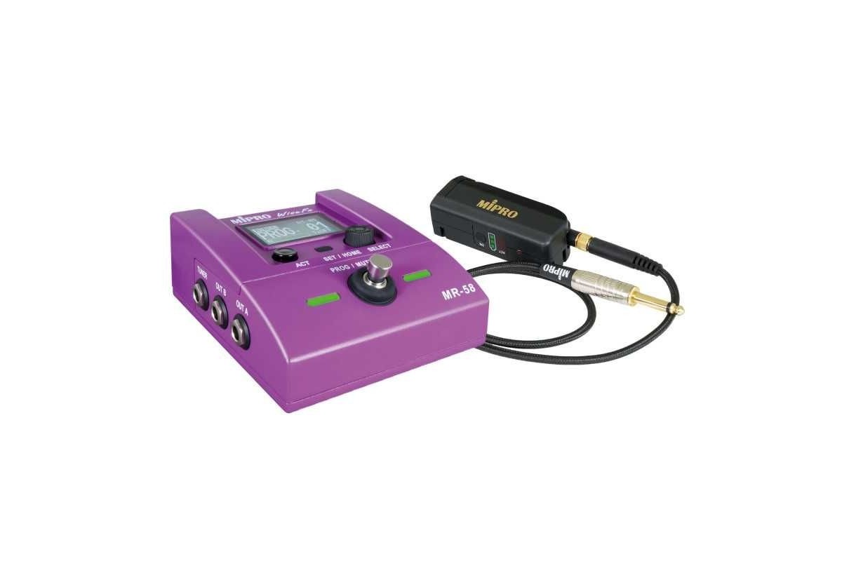 Mipro MR-58GE - приймач-педаль, має стійкий корпус і панель управління, як MR-24, і має власний колір. Він оснащений схемою прийому 5 ГГц, що є найдосконалішою моделлю в діапазоні ISM на сьогодні. Крім чудових характеристик проти перешкод та більш сумісних каналів, він має ідеальний та якісний звук.
