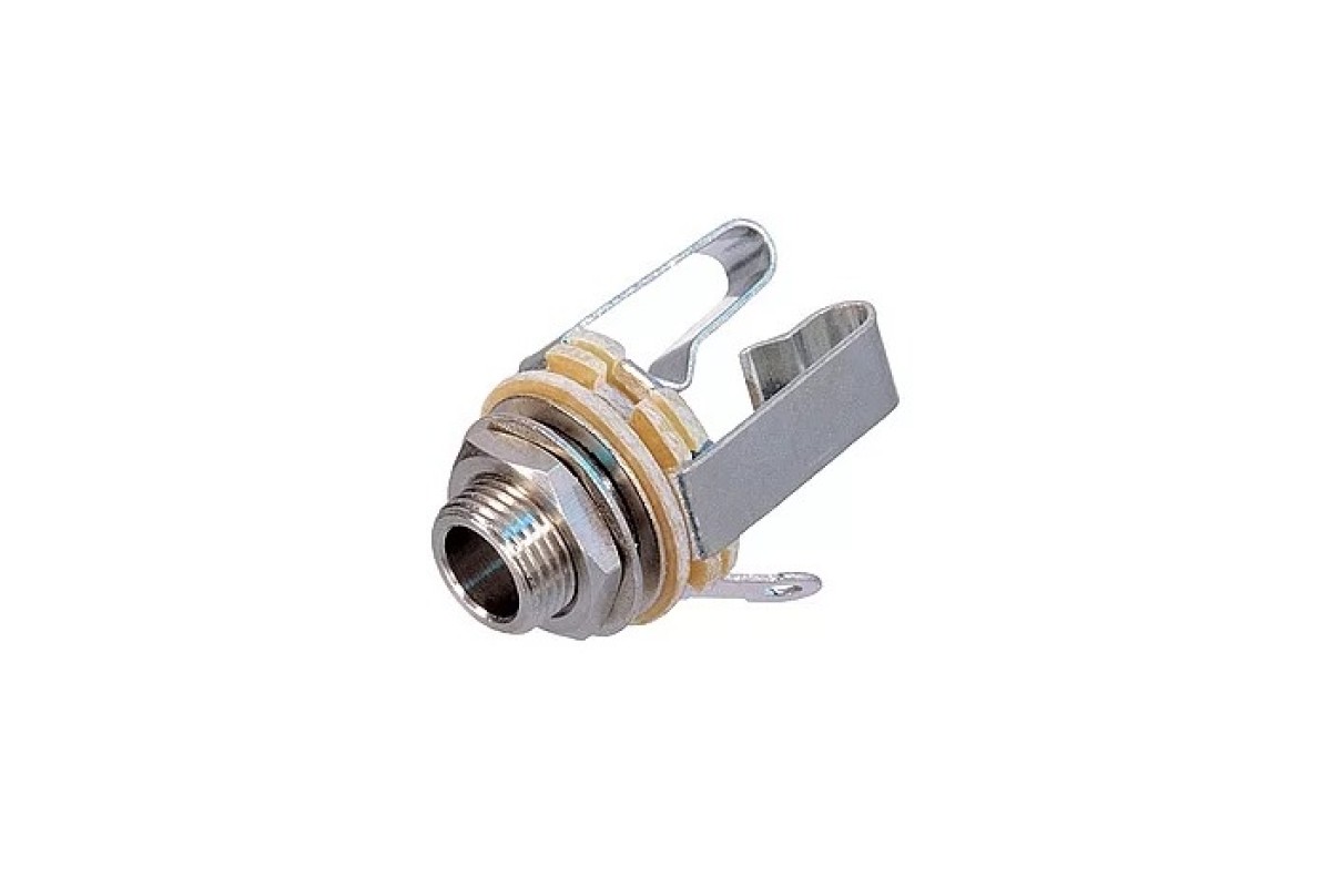 Панельний роз'єм 1/4" Jack, 2-х контактний (моно) <гніздо/мама>, металевий нікельований корпус з металевою шайбою та гайкою, на панель не більше 3.5 мм, плоскі контакти 0,205 дюйма, під паяння.