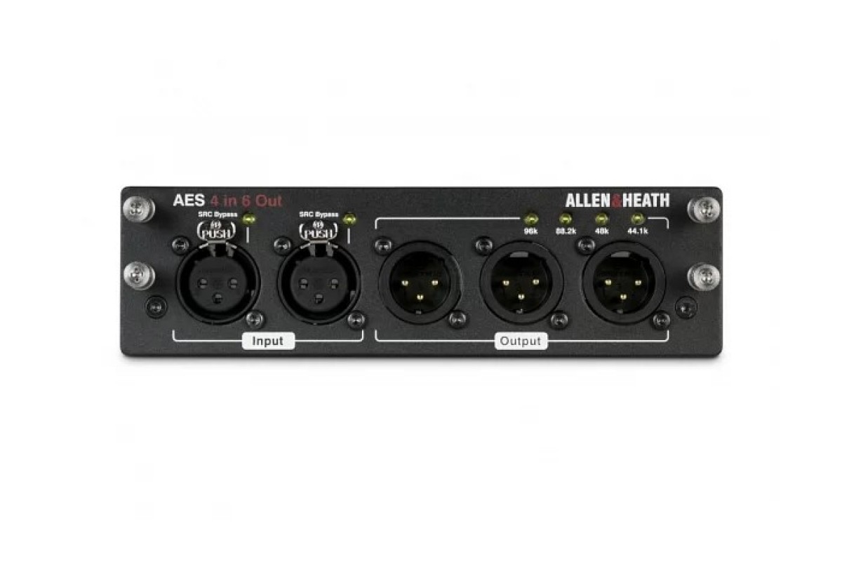 Allen & Heath dLive-M-DL-AES4I6O-A - карта розширення AES3 I / O для dLive на 4 входи і 6 виходів. Плата вводу-виводу AES3 забезпечує зручне рішення для цифрового з'єднання між системою dLive і системою PA, моніторних підсилювачів і контролерів акустичних систем або при комбінуванні консолей. Модель підходить до мережевих слотів будь консолі dLive S Class або dLive C Class, а також для всіх реків MixRack. Частота дискретизації вихідного сигналу для карти перемикається між 96 кГц, 88,2 кГц, 48 кГц і 44,1 кГц, в той час як входи забезпечують частоту дискретизації від 32 кГц до 192 кГц. Карта AES3 може бути підключена до будь-якого порту вводу-виводу в MixRack або Surface dLive S Class або dLive C Class.