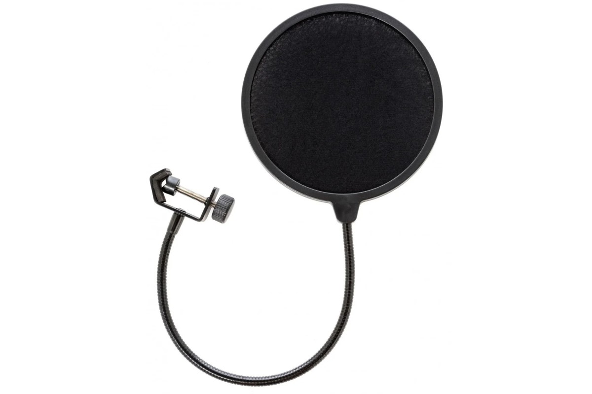 Нейлоновий поп-фільтр для мікрофону. Гнучка гусяча шия з універсальним затискачем для кріплення трубки. Кругла форма.