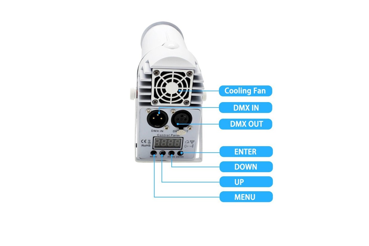 Прожектор має вузький кут розкриття 12°, що дозволяє спрямовано висвітлювати дзеркальну кулю і створювати ефектні відблиски по всьому приміщенню. Електронний дисплей забезпечує зручне налаштування параметрів, а підтримка режимів звукової активації, автоматичного режиму, DMX та стробо ефекту робить пристрій гнучким для використання у будь-яких шоу-програмах.