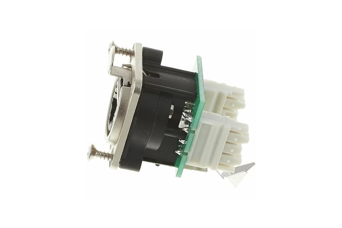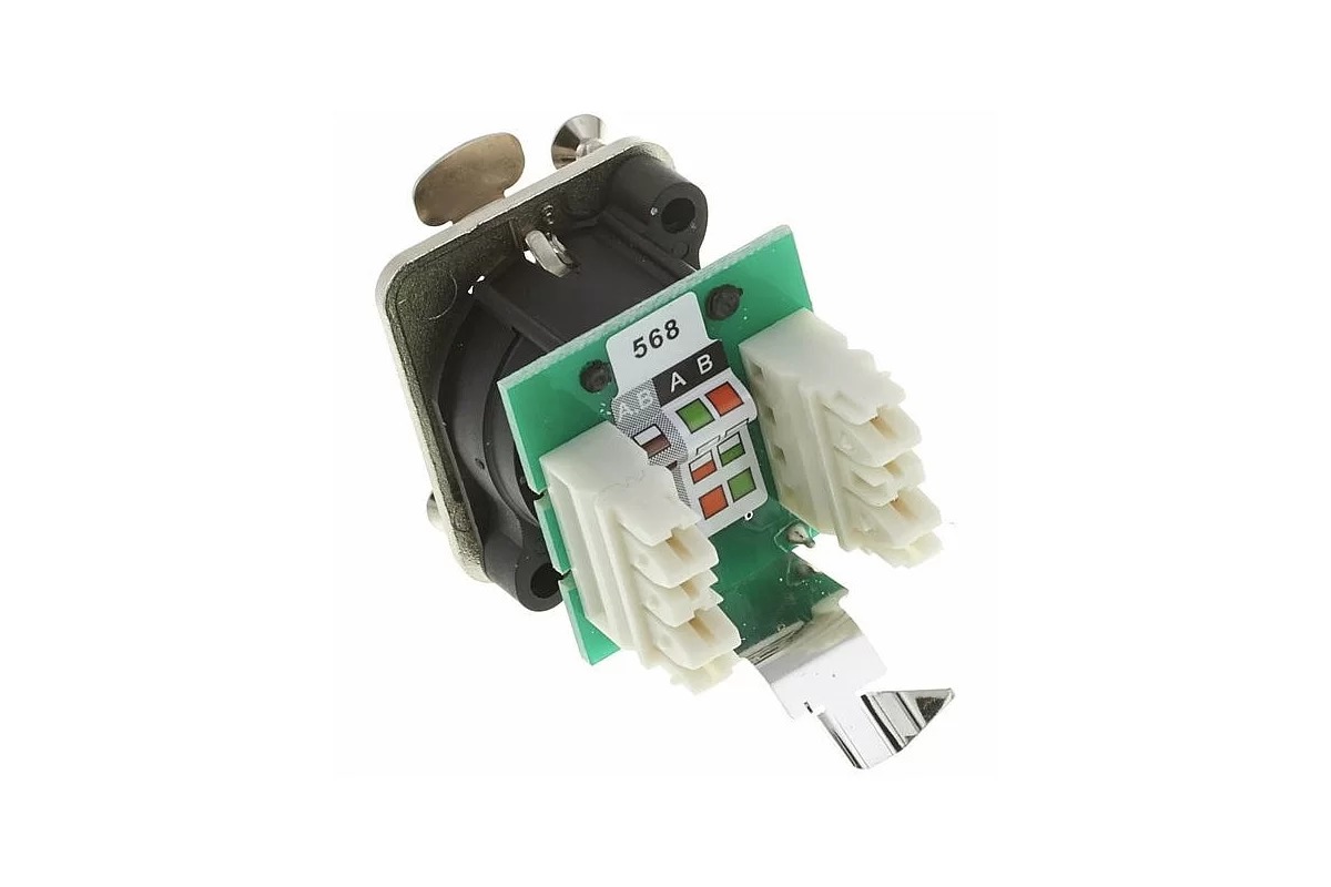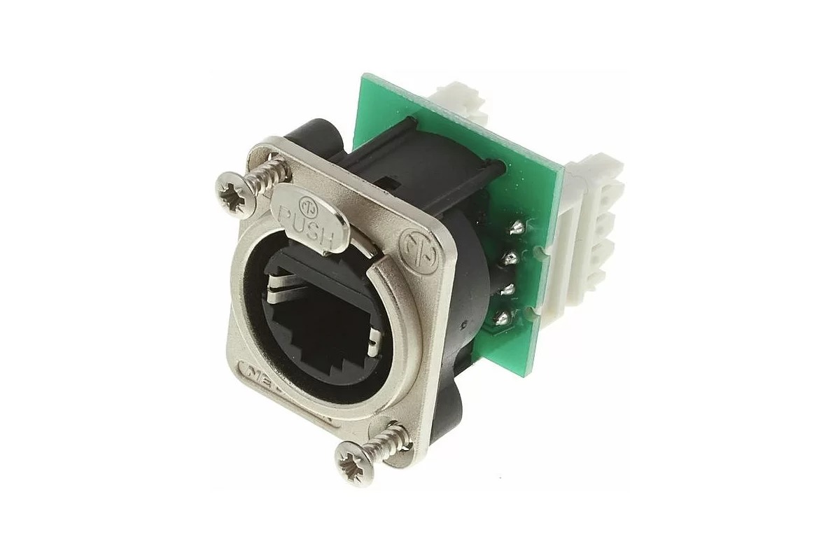 Панельний роз'єм RJ45 EtherCON <гніздо/мама>, CAT 5е, D-серія, металевий нікельований фланець D-типу, пластиковий корпус, фіксація замку за технологією "Latch lock", контакти - покриття золото, під затискач дроту IDC-110 з глибоким продавлюванням дроти. Максимальна товщина панелі 4 мм. Кріпильні гвинти у комплекті. Підходить для дротів перетином 0.14-0.5 мм2 (AWG 26-20).