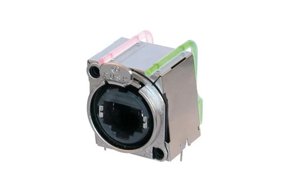 Панельний роз'єм RJ45 EtherCON "гніздо/мама", повністю екранований, B-серія, металевий нікельований фланець А-типу, відповідає класу D, горизонтальна установка PCB, закритий металевий корпус для захисту від RF, фіксація замку за технологією "Latch lock", дві світлодіодні трубки для відображення стану передачі даних, рекомендована висота світлодіода 5.6 мм, контакти - покриття золото. Максимальна товщина панелі 3 мм.
