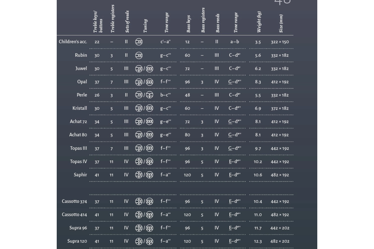 Аккордеон Weltmeister Saphir – это профессиональный 4-голосый инструмент немецкого производства, сочетающий в себе высокое качество изготовления, мощное звучание и удобство в использовании. Эта модель является одной из самых больших клавишных аккордеонов в линейке Weltmeister без ломаной деки, что обеспечивает ей особую акустическую характеристику и эстетичный вид.