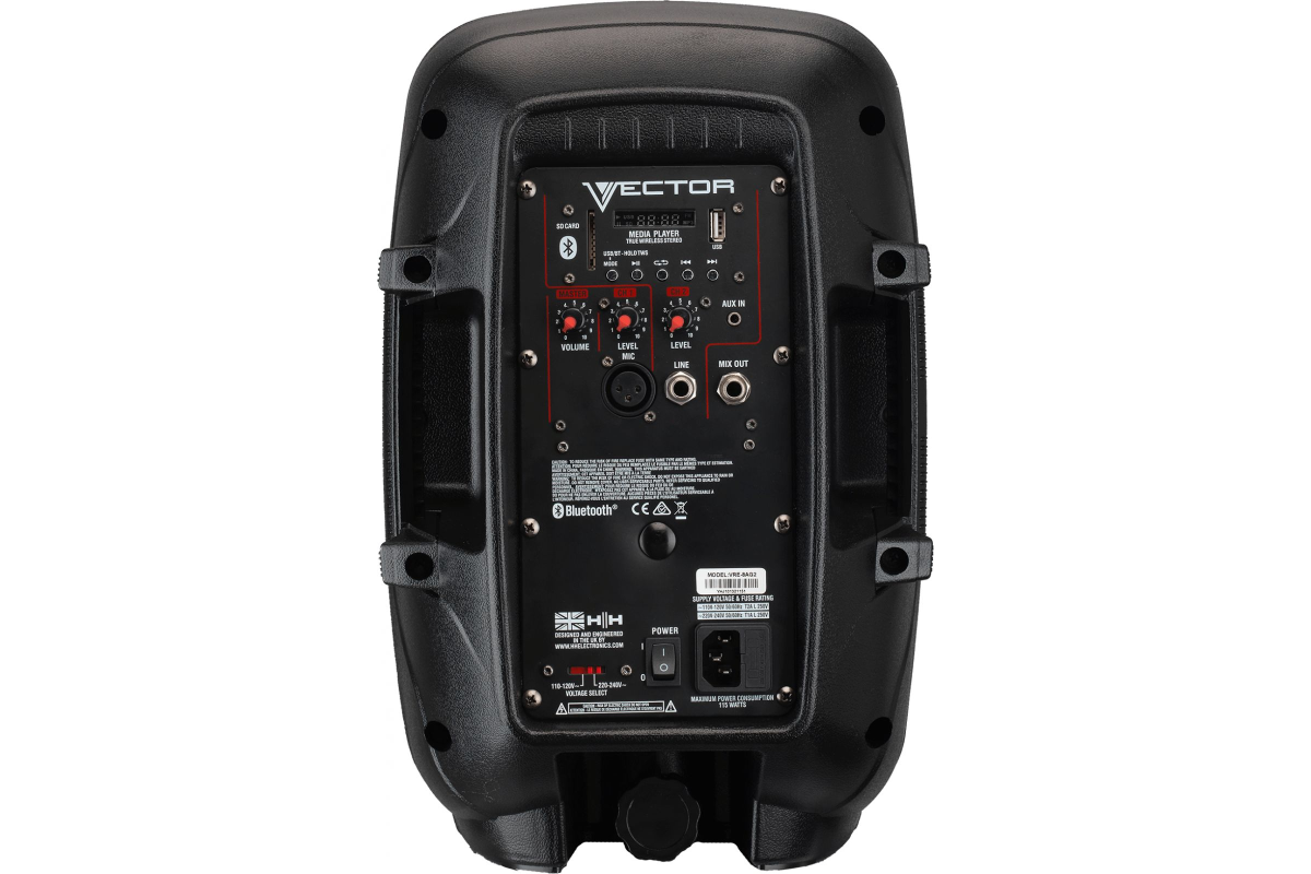 HH Electronic VRE-8AG2 - активная 2-х полосная акустическая система, мощность 300 Вт, динамики НЧ 8" и ВЧ 1", 3 канала, эквалайзер, микшер, Bluetooth, USB, SD карты памяти, стакан для стойки.