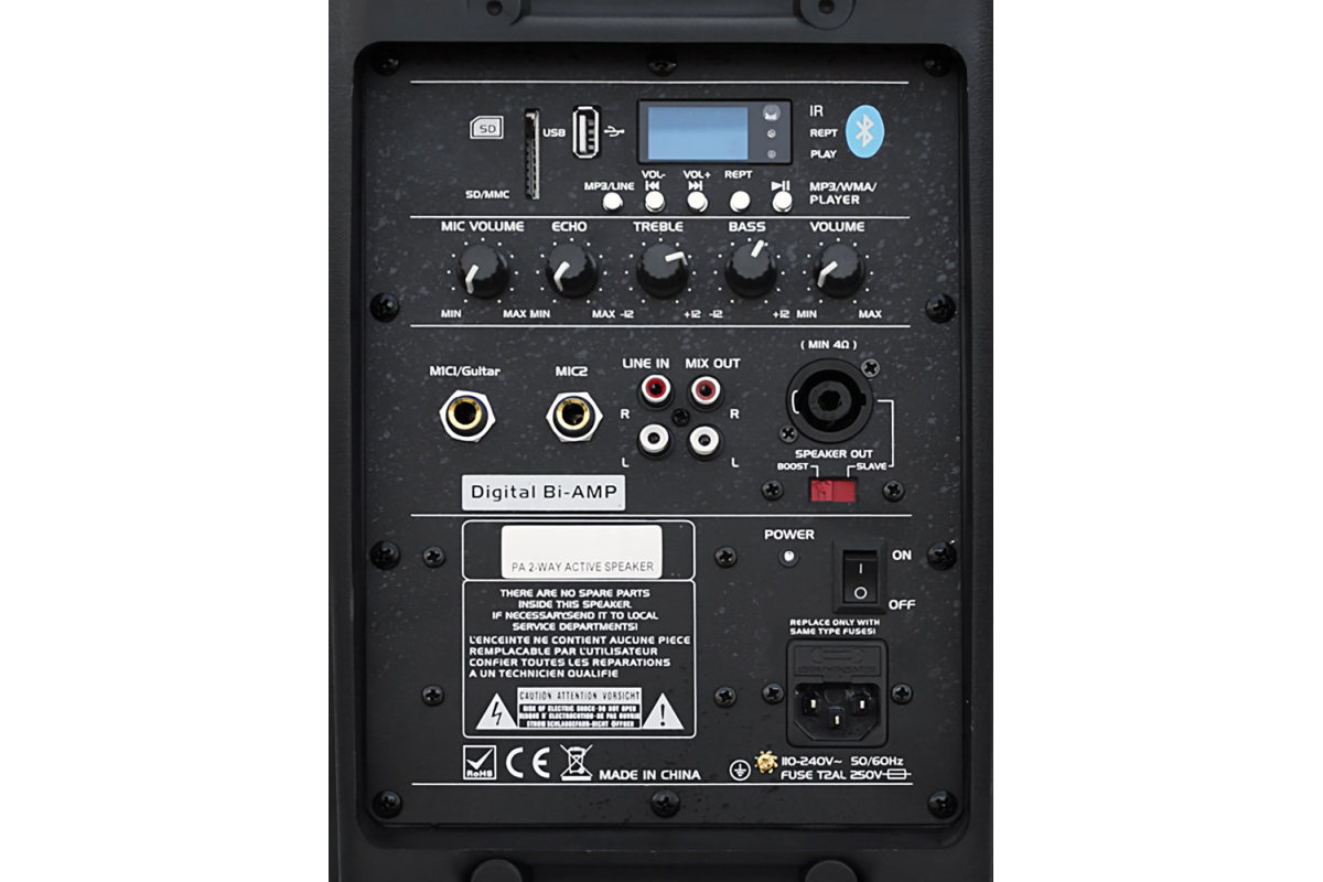 Встроенный медиаплеер с поддержкой USB/SD карт и Bluetooth позволяет воспроизводить музыку без дополнительного оборудования. Также предусмотрены входы 2 x 1/4" Jack , RCA in/out и выход Speakon для подключения дополнительной пассивной акустики.
