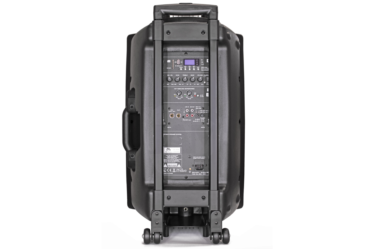 Для удобства пользователя предусмотрены два 1/4" джек входа, RCA, стерео миниджек 3,5 мм , поддержка iPod/mp3, а также 2-полосный эквалайзер и делений. Корпус из прочного ABS пластика , колеса и ручка обеспечивают комфортную транспортировку, а стандартный "стакан" 35.