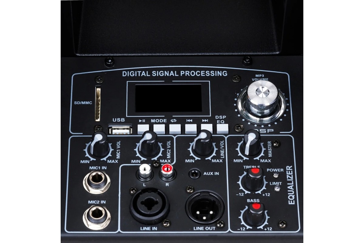 Микшерная секция имеет 2-полосный эквалайзер с регулятором общей громкости и отдельные регуляторы громкости для микрофонов и линейного входа. Регулятор громкости MP3-плеера также выполняет контроль DSP.
