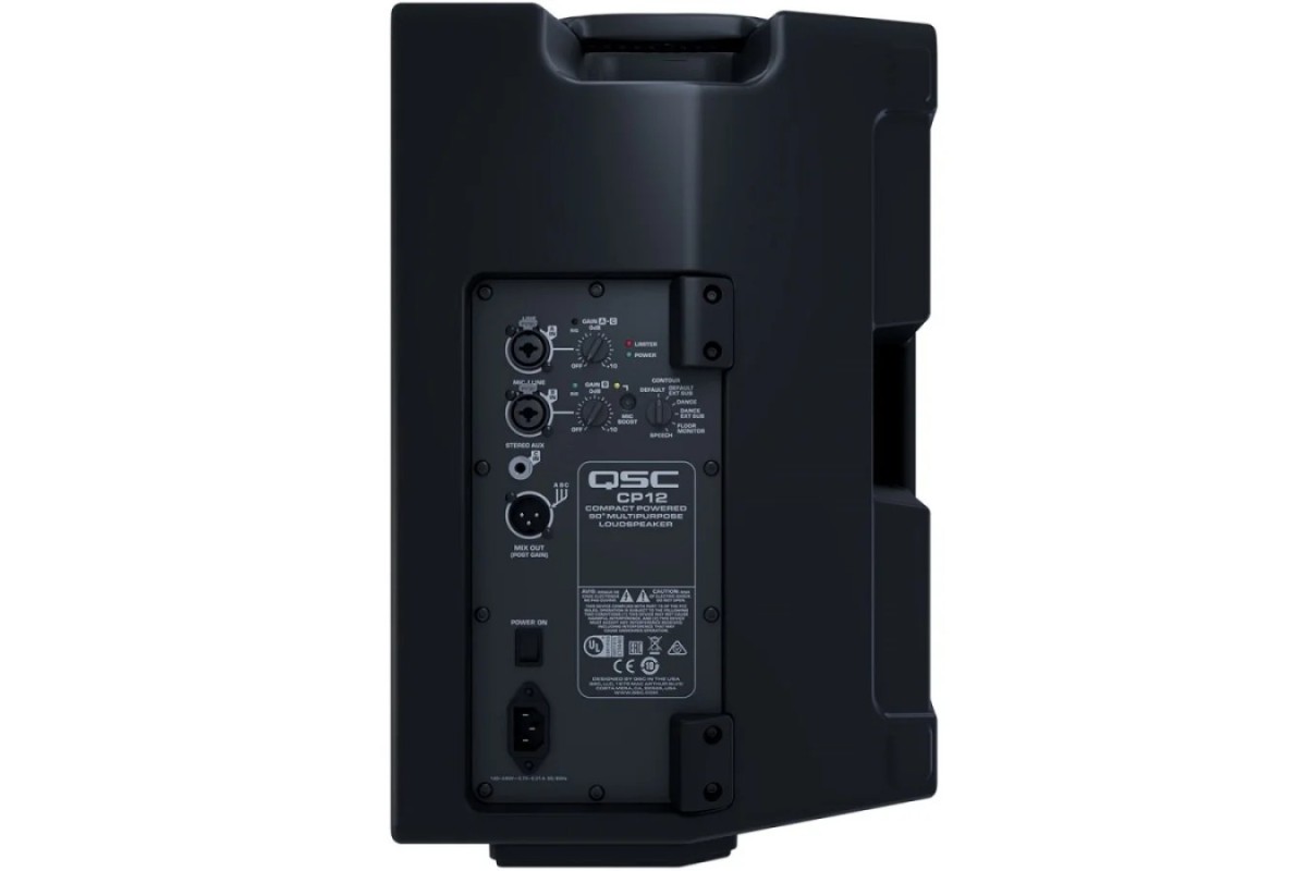 CP12 – 12-дюймовая активная акустическая система, усилитель 800 Вт НЧ + 200 Вт ВЧ (пиковая) усилитель класс D, НЧ 12", ВЧ 1,4", Покрытие 75° осесимметричное, частотный диапазон 47 Гц - 20 кГц, -10 DSP процессор, 2 входа XLR+TRS 1/4" + 1 вход minijack TRS 1/8", 1 XLR выход суммы, 3 точки подвеса М10, 35 мм стакан для установки на стойку, корпус – полипропилен, 516 мм x 350 мм x 323 мм, 13,7 кг.