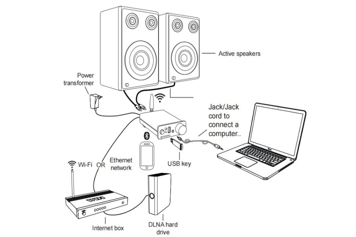 Функции: воспроизведение через WI-FI, воспроизведение через USB, вход AUX, разъем RJ45, Bluetooth
