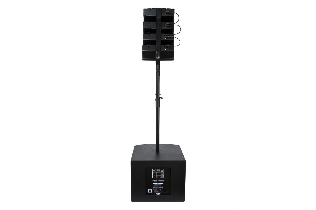 Акустическая система оборудована мощным усилителем D-класса со встроенным DSP-процессором и номинальной мощностью 700 Вт . Сабвуфер выполнен в крепком МДФ-корпусе и оснащен 15' динамиком с катушкой 2,5' и магнитом в 50 унций. В ABS-корпусе каждого из 4-х сателлитов расположены по два 4' полнодиапазонных динамика и 1' купольный твиттер.