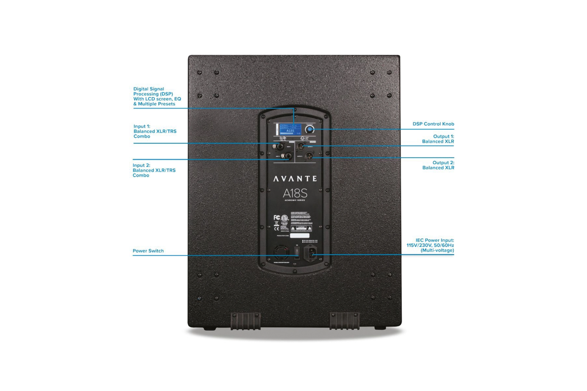 Avante A18S – активный сабвуфер серии Achromic, обеспечивающий мощные низкие частоты, четкий звук и высокую производительность. Встроенный цифровой сигнальный процессор, ЖК-дисплей и широкие настройки эквалайзера позволяют точно управлять уровнем звука, режимами работы, расположением и задержкой сигнала. Сабвуфер подходит для музыкантов, концертных групп, молитвенных домов, прокатных компаний и стационарных инсталляций.