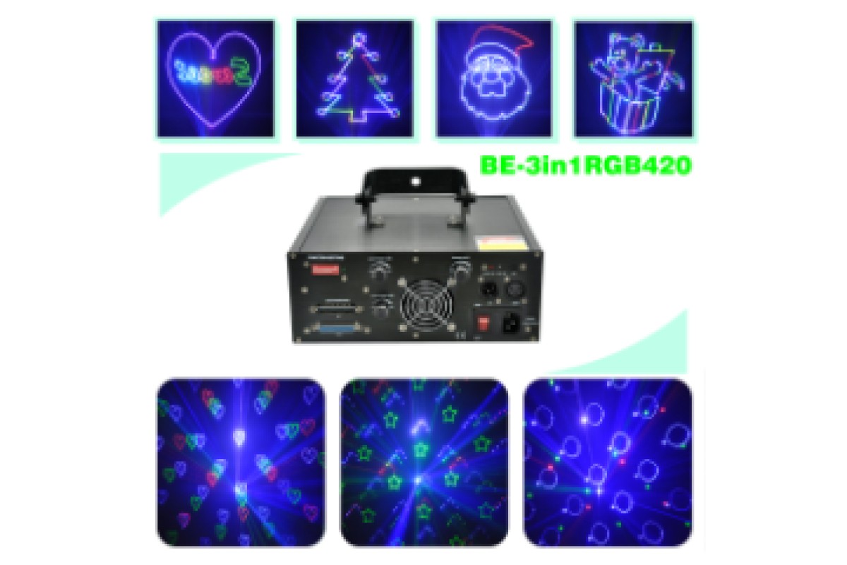 Повнокольоровий мультимедійний лазер, який поєднав три різні прилади в одному корпусі, створений для живих шоу, анімаційних ефектів і сценічних проекцій. Підтримує як стандартні режими, так і ILDA для комп’ютерного керування анімацією.